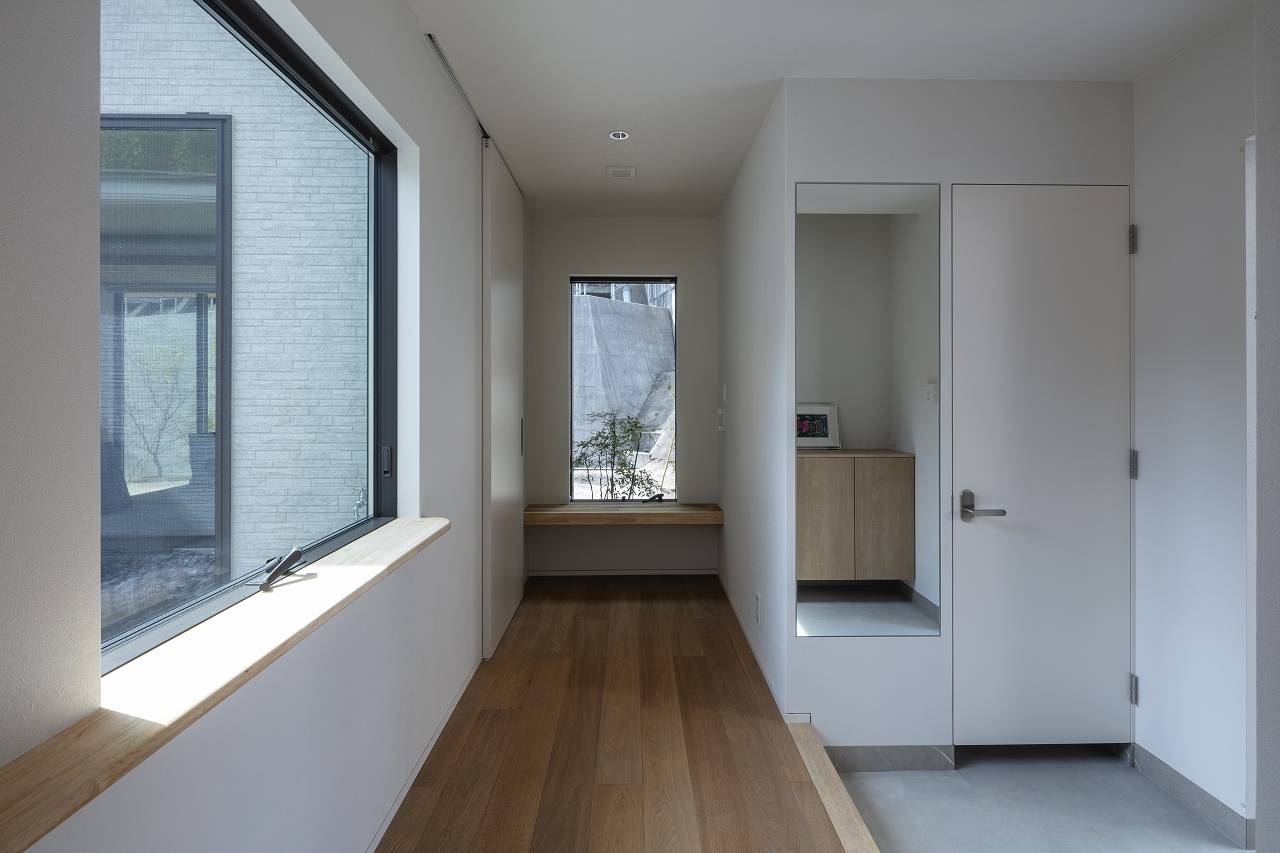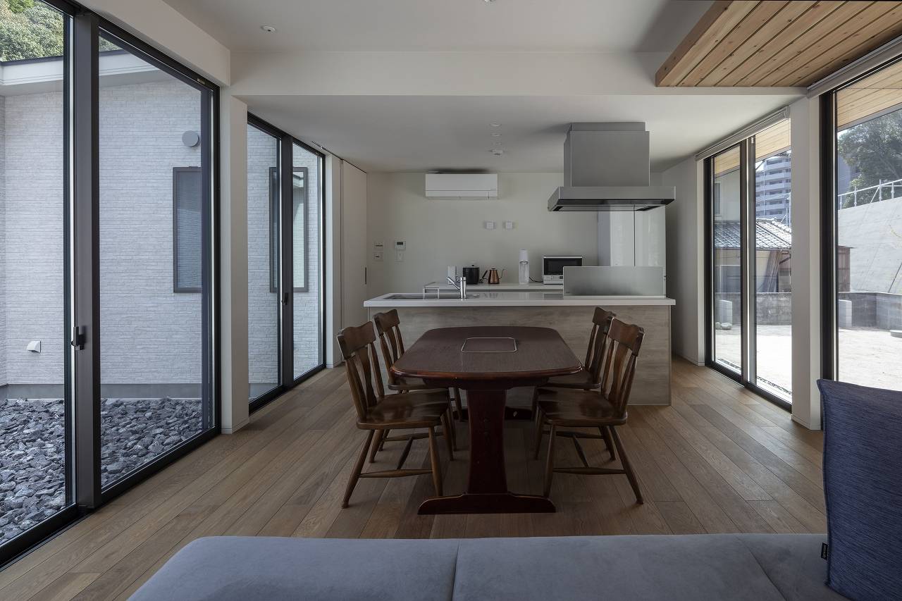 中庭を設けることで、光だけではなく、風の流れを作ることができ、谷合の敷地ならではの湿度の高さをなくしている。