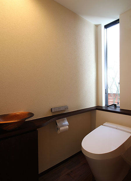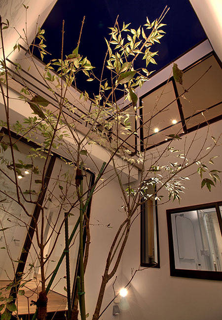 また、 中庭に植えるシンボルツリーはご夫婦と植栽畑にご一緒し、ゆっくりと成長するアオダモを選んでいただきました。落葉樹ですので冬は葉が落ちますが、自然光が1階まで降り注ぎ、常緑下草類の混植により、1階の浴室などからも風情ある眺めが望めます。このアオダモの 樹高はまだ2階の床レベル付近(よって2階からはまだ見下ろす関係)ですが、 この若いご家族の時間経過とともに、住まいの移り変わっていく景観を楽しんでいただけたらと思っています。