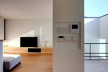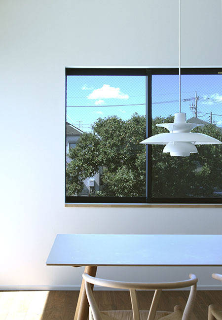 若いご夫婦から依頼されたお住まいの設計でした。敷地の南側と東側は隣戸が近接していますが、西側は大きな畑でのどかな眺望が広がっており、当初はこちらに向けて大きく開くプランを提案しようと考えていました。しかし「この環境が将来的に約束されているわけではいので、あまり期待し過ぎない方がいいのでは?」と、とても適格!かつ大人!なご意見などもいただき、考え直すことにしました。