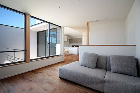 そんなわけで、まずLDKは 2階 とし、敷地の北東に駐車場、南西に 中庭を置く配置としました。主要な部屋の採光、通風、眺望などはこのプライバシーの確保された中庭から享受する計画です。また、 リビングとダイニングは 雁行して並ぶ付かず離れずの関係とし、天井高の違いなどから空間に 抑揚をつくり出します。 もうひとつの特徴は2階の一角にある スタディーコーナーで、大型の引戸で仕切れば個室化してオンライン会議などもし易いテレワークスペースとなります。