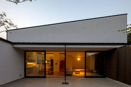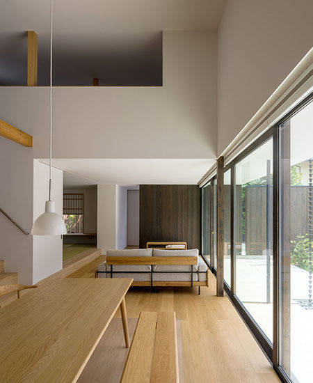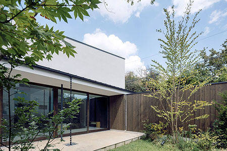 西側部分は平屋、北側は2階建てとしたL型の建物配置で、敷地のやや東側に南北に走る一枚の独立塀によりプライバシーの確保された大きな中庭を構成。その塀や周囲の軒先のラインは極力高さを抑えることで、家の中心となる中庭に明るさと開放感、視線の抜けなどをもたらしています。隣戸の緑に関しては、2階東側の子供室からの眺望享受と、中庭の緑が塀越しの借景と繋がることなどを狙った計画です。