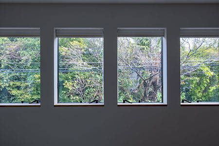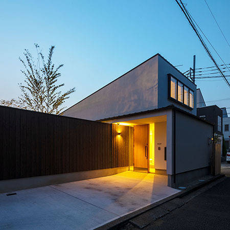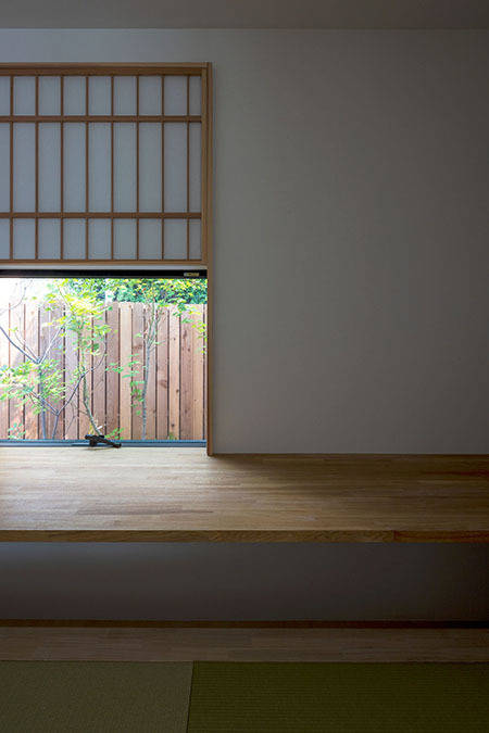 現在、東側の道路から見ると、中庭の木々はこの壁の上から少しだけ顔を出す程度です。しかしお子様の成長とともに、数年のちに高く大きく生い茂るようになり、焼杉の経年変化も相まってファサードをより味わい深く、お向かいの緑あふれるお宅同様、町の景観にも潤いを寄与するものへと変化していくことを期待しています。