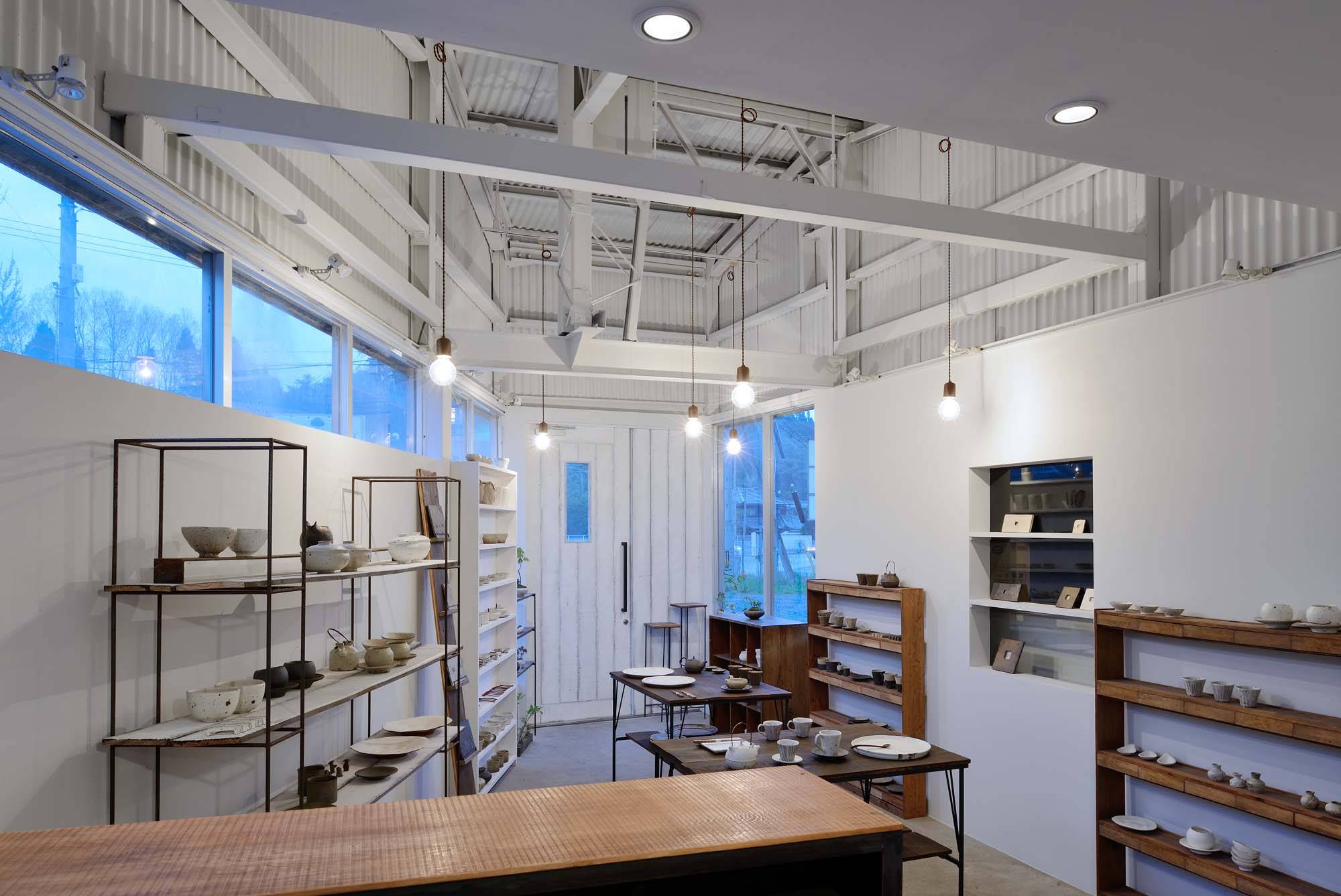 幹線道路に面した元自動車整備工場の一部を陶芸家の店舗兼ギャラリーに改修する計画である。 経年変化の風合いを感じられる空間というテーマは、作家自身の作品テーマとも繋がっており、既存建物の構造体をそのまま白く塗り込めた空虚(うつわ)によって、「時間の流れ」を作品と共に楽しめる空間となることを目指した。
