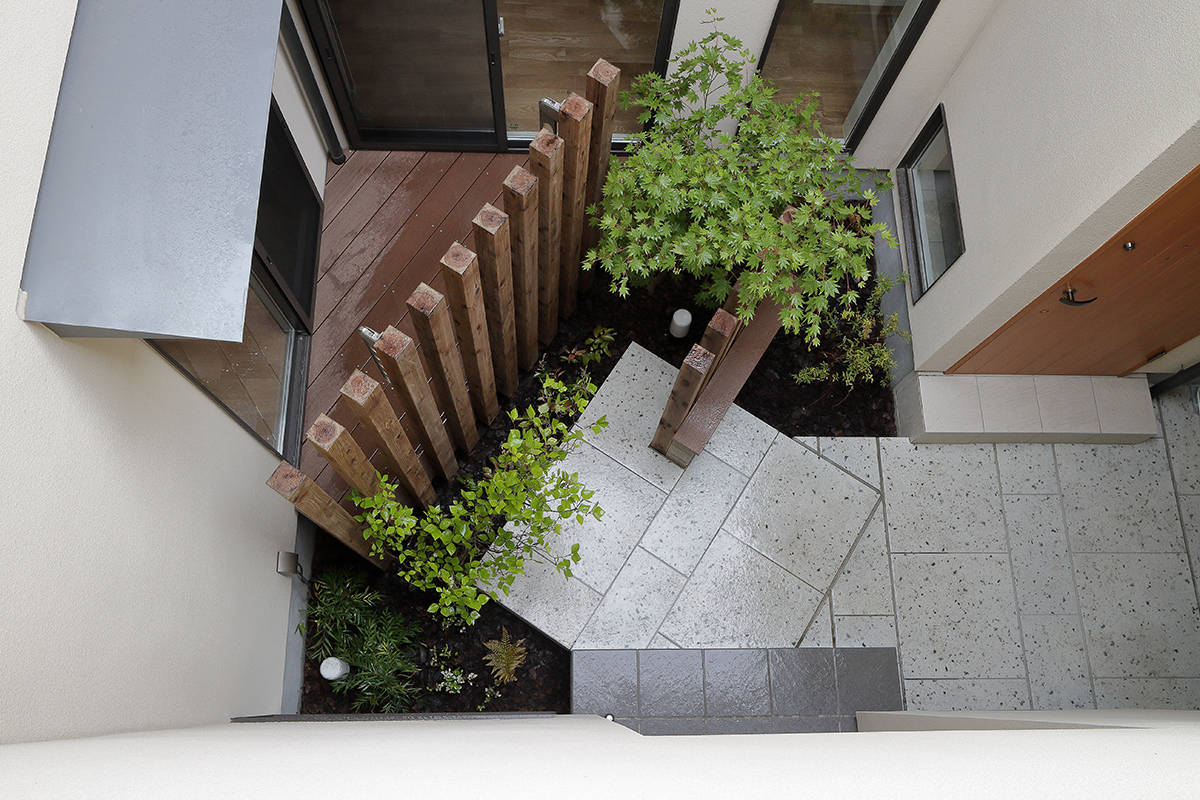 設計者としては、その昔、河川敷だった歴史、ゲリラ豪雨対策を念頭に、完全閉鎖型の中庭ではなく、ガレージやアプローチ部分を中庭につなげて雨水処理のしやすい形であることを大事にしました。外界とは一線を画した中庭を2世帯で共有することで、世帯同士の程よい距離感、様々な景色をつくり出しています。