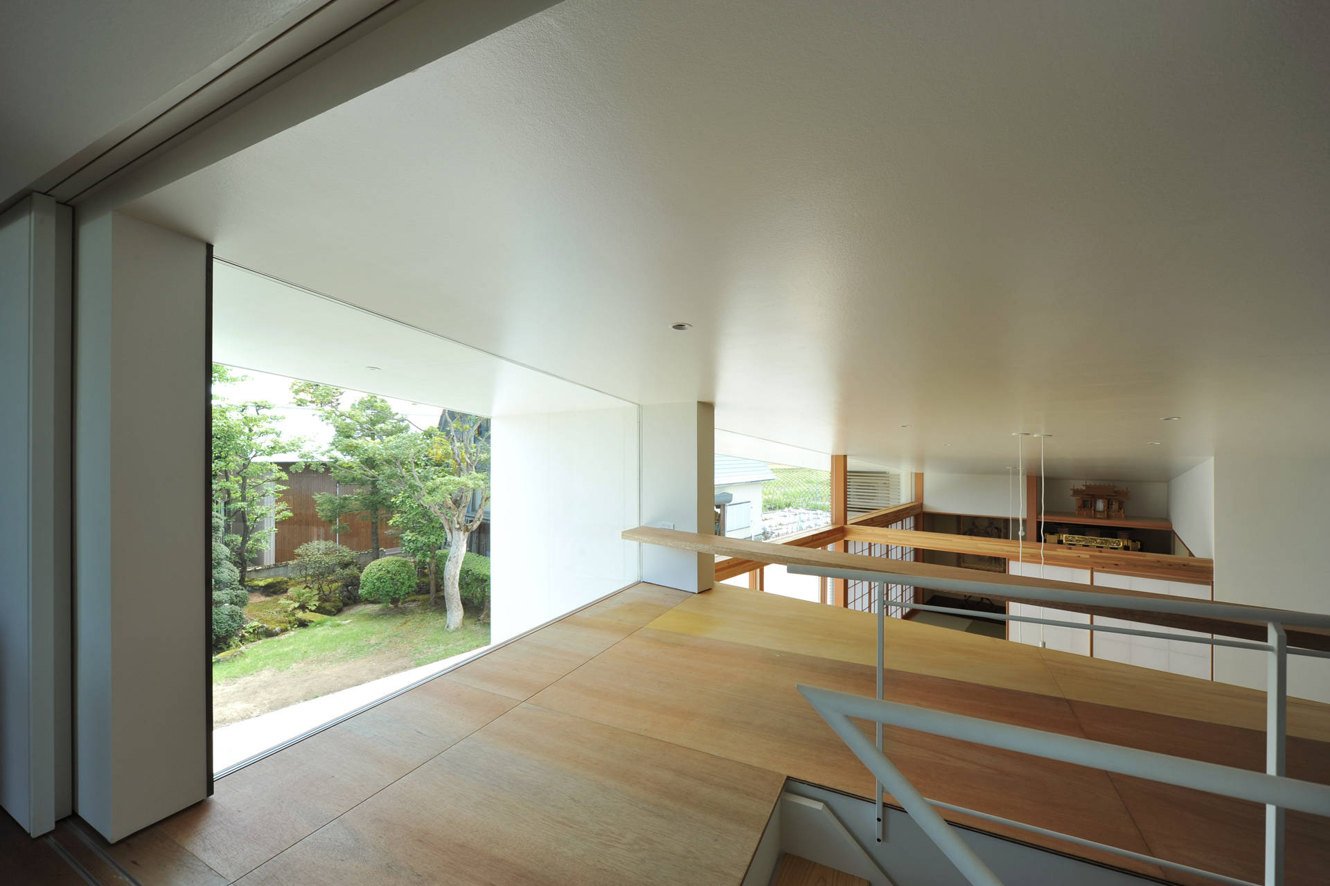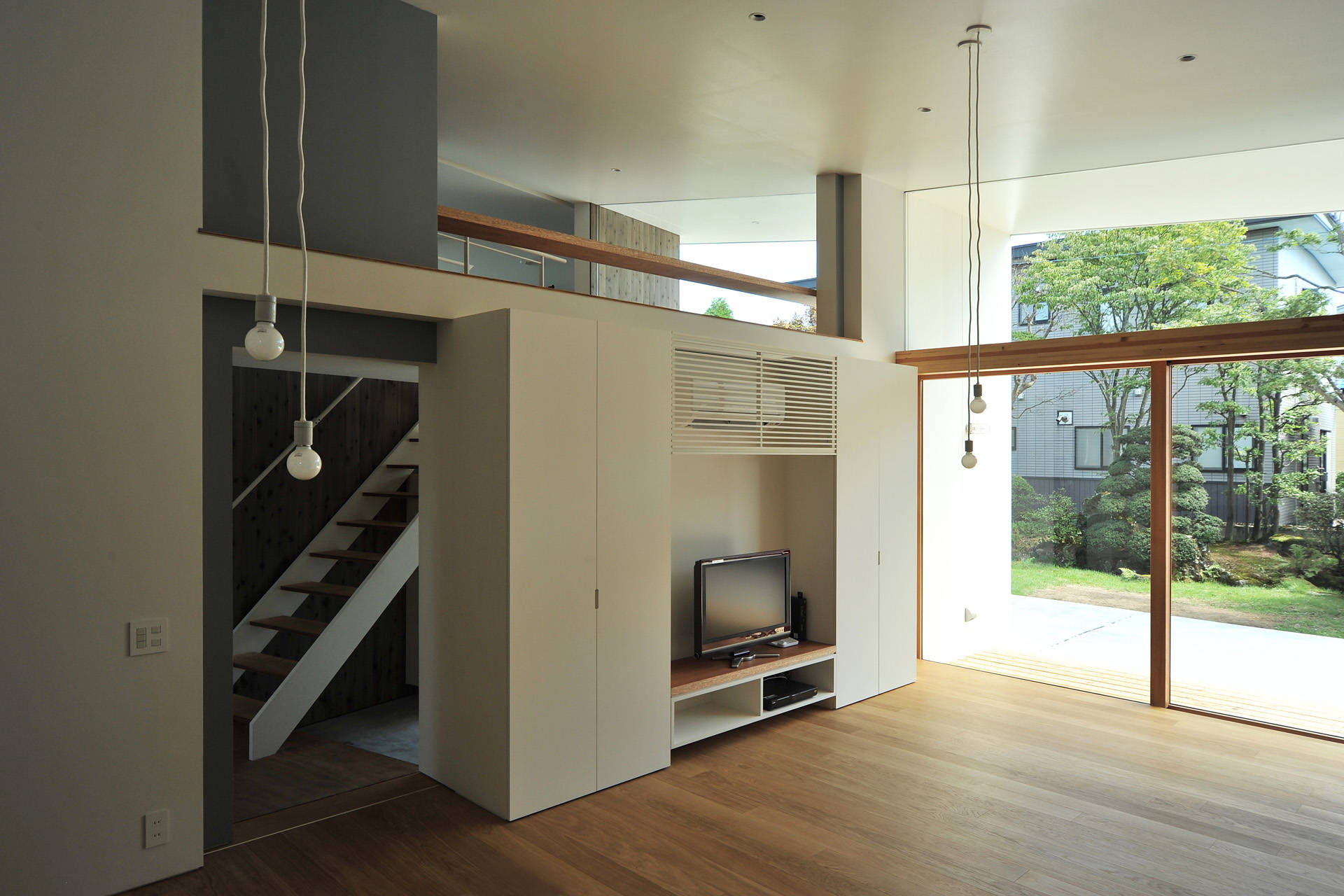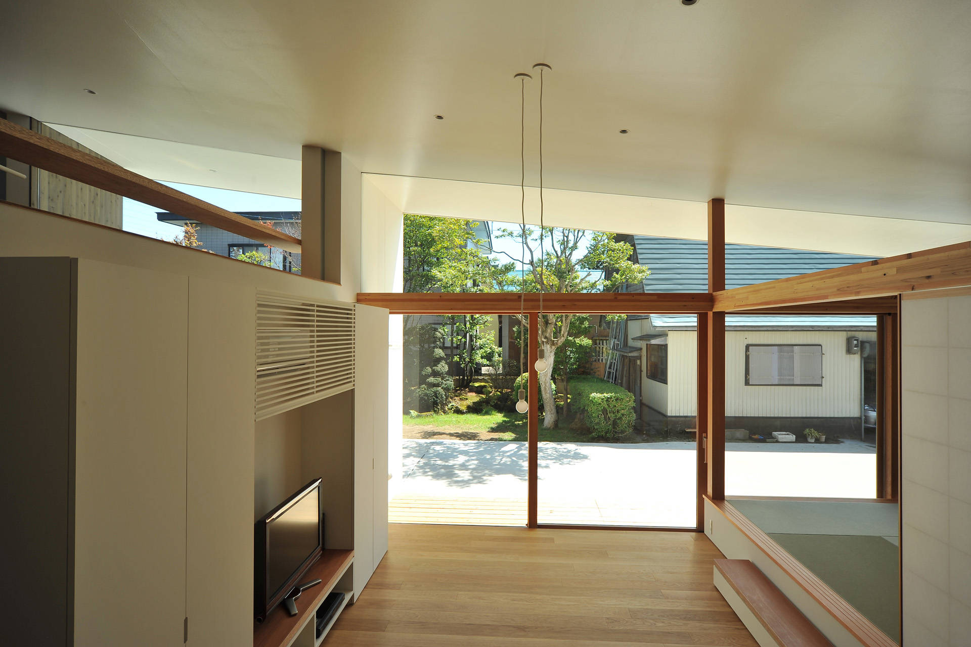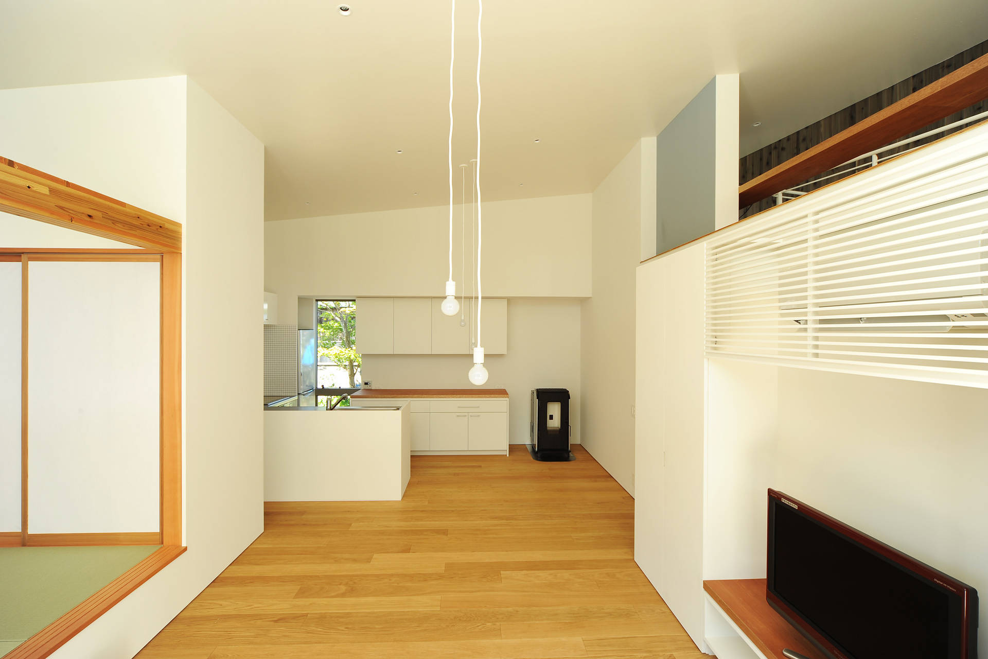 生活スペースの全てを1Fに配置し2Fは天井の低い大きなロフトとする平屋のような建ち方を提案。
