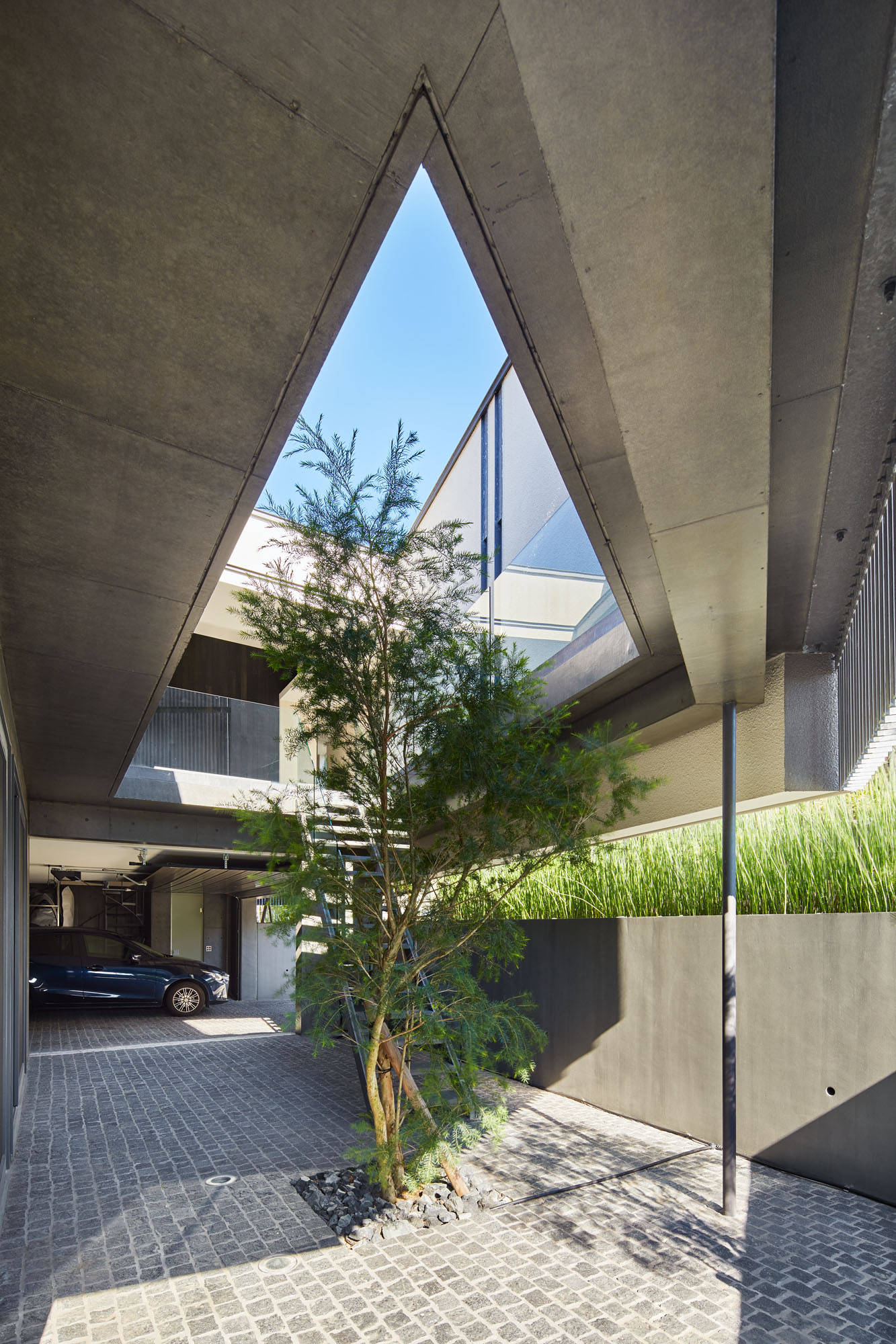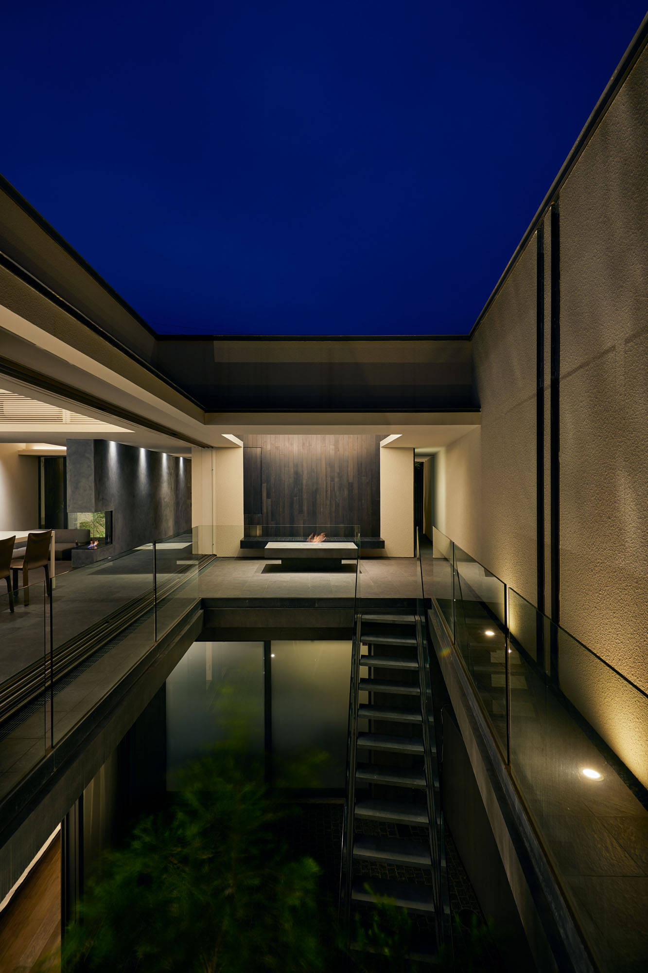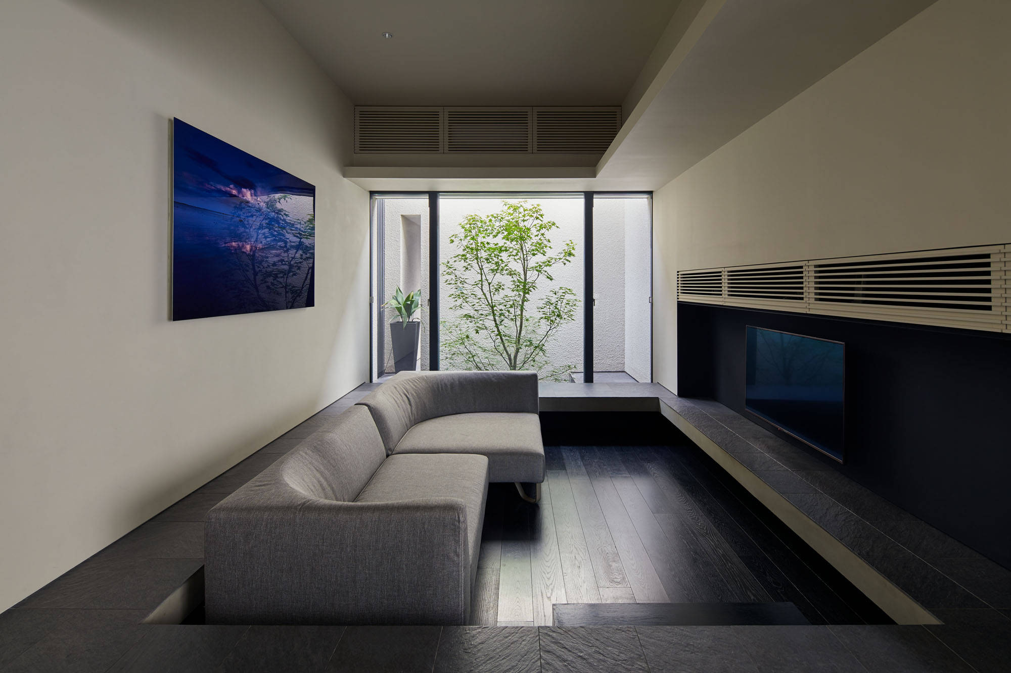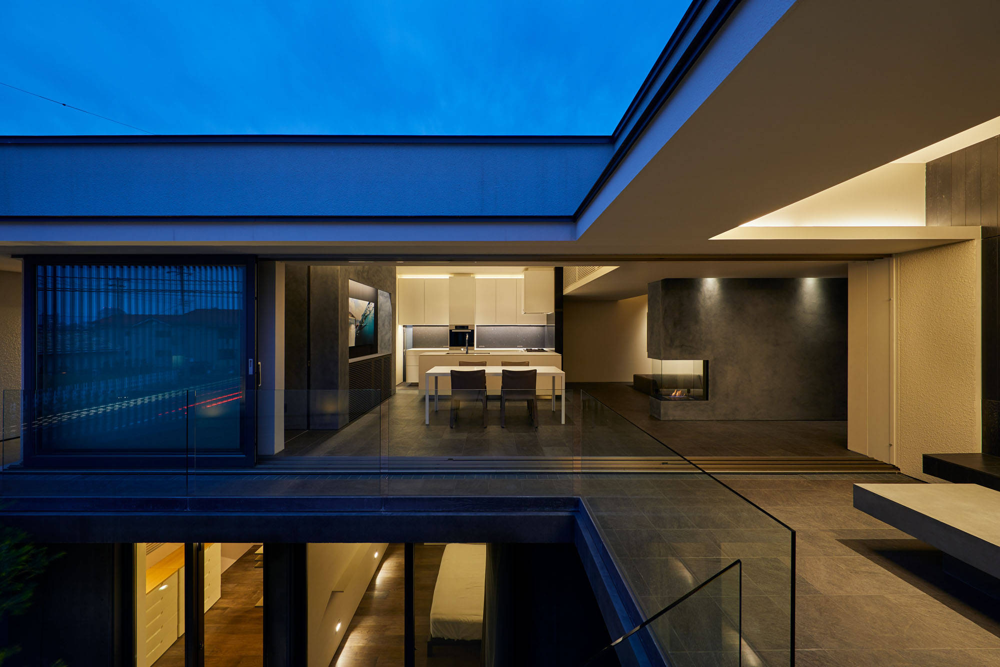 厚い土木擁壁により囲まれた地下のような中庭と個室群、その上に浮かぶ木造のリビング空間。