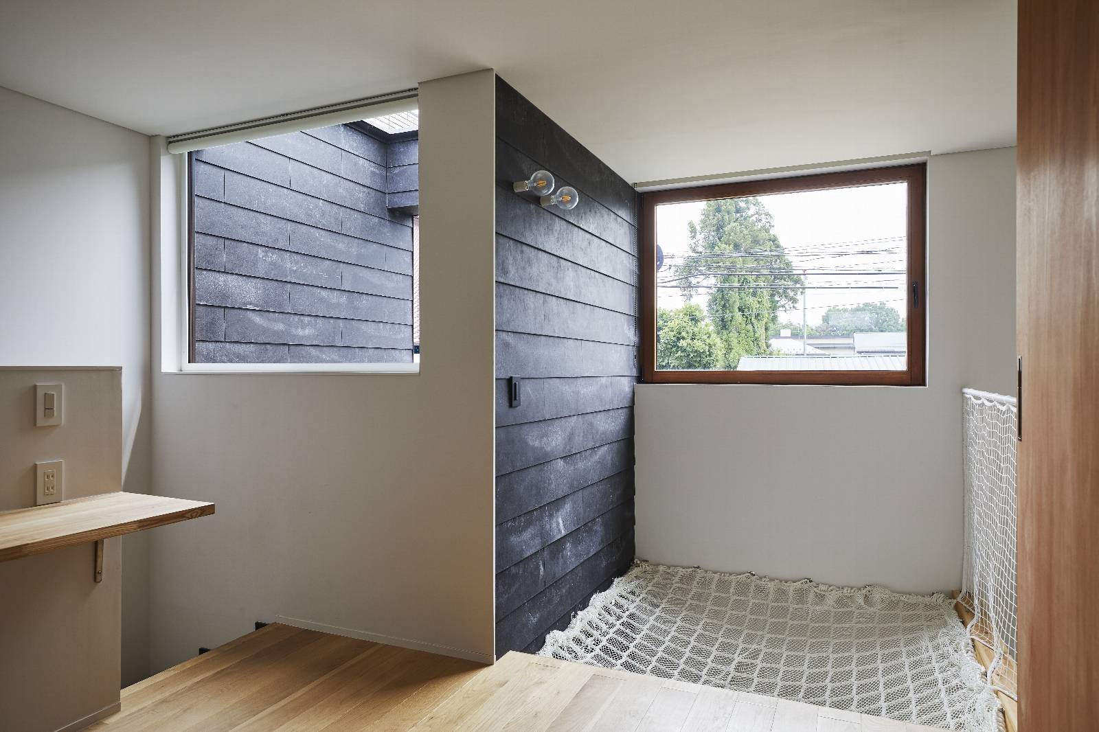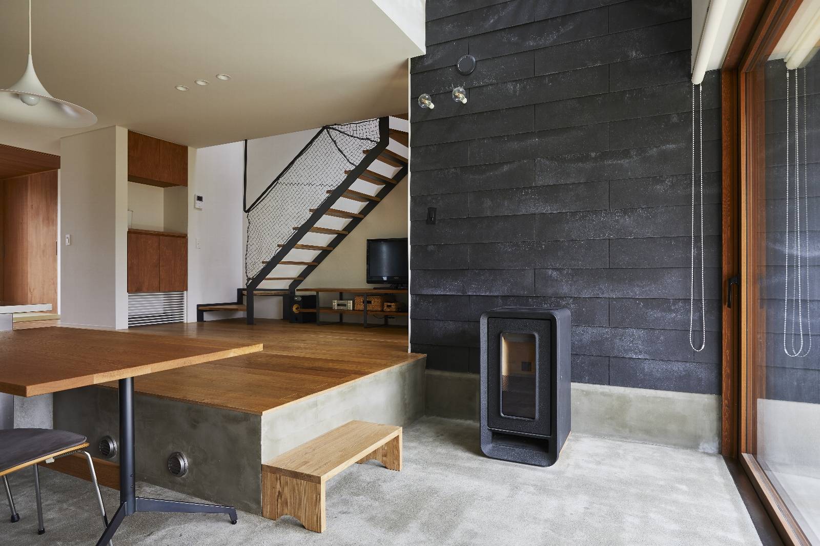 また、セカンドリビングとなる土間テラス内部に吹抜けを設け、縦方向の開放感を創出すると共に、単調になりがちな箱型の空間においても上下階を緩やかにつなぐ効果も与えている。また、この吹き抜け空間は、床下エアコンとペレットストーブの暖気を効率的に家全体に広げる空調空間としても機能する。