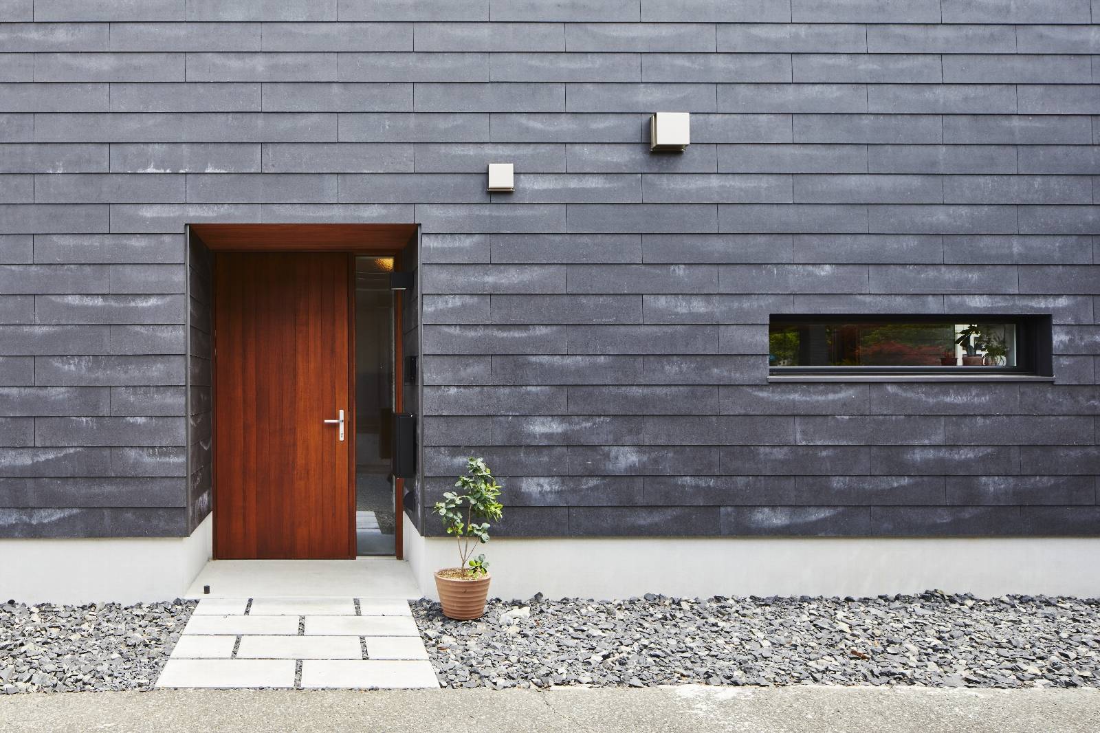 外壁には、遠景として箱型の住宅をひとつのかたまり(マッス)として見せつつも、近景としては、生きた素材感と多様な表情を生むSOLIDO typeM_LAPの鉄黒とした。地方都市の市街地において、従前の街並みに新しい風景を生むことで参加するような建物のあり方を目指した。(地方都市の旧街道筋では建替えに伴う歯抜け状の街並み風景が増えている)。