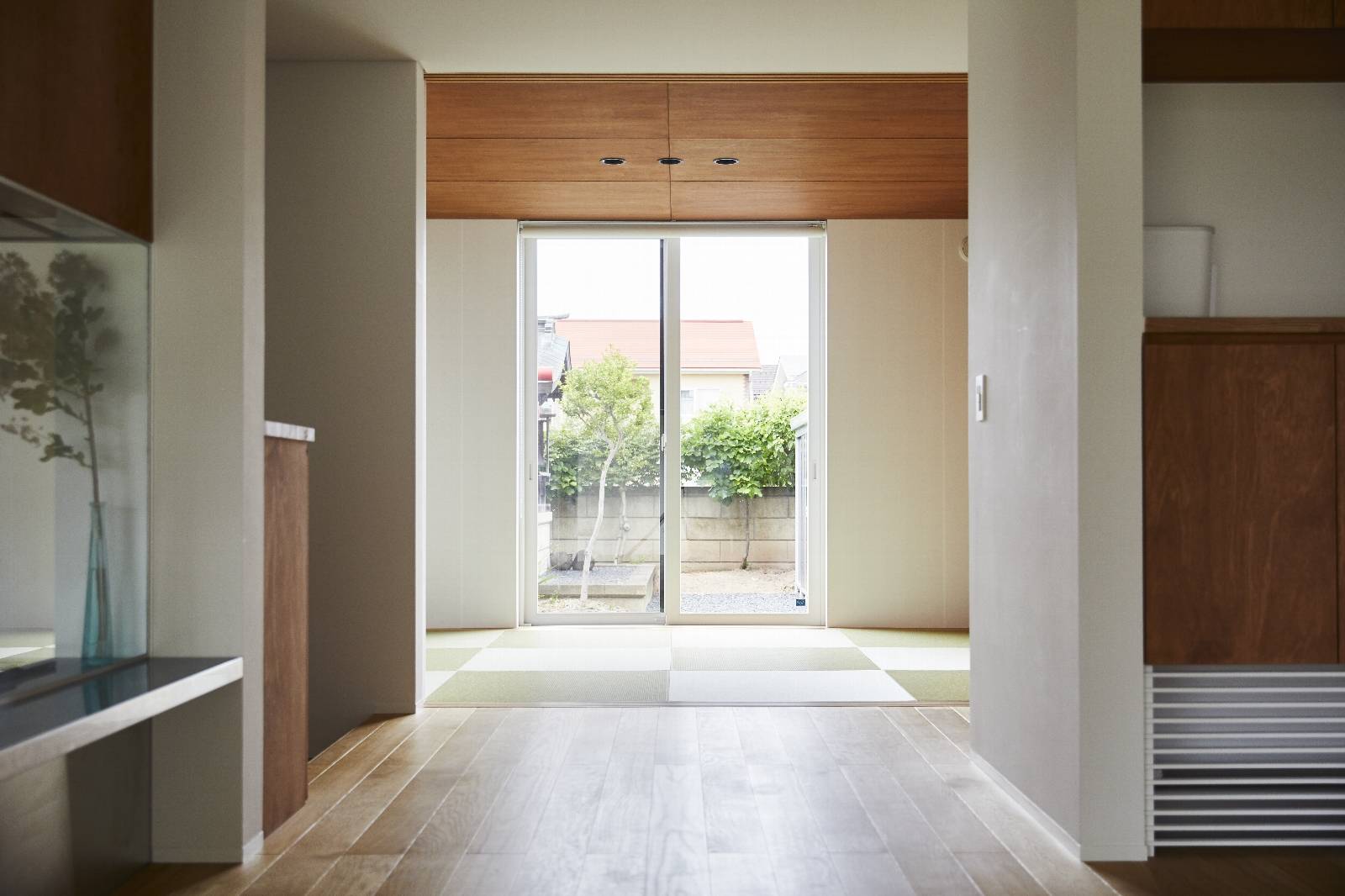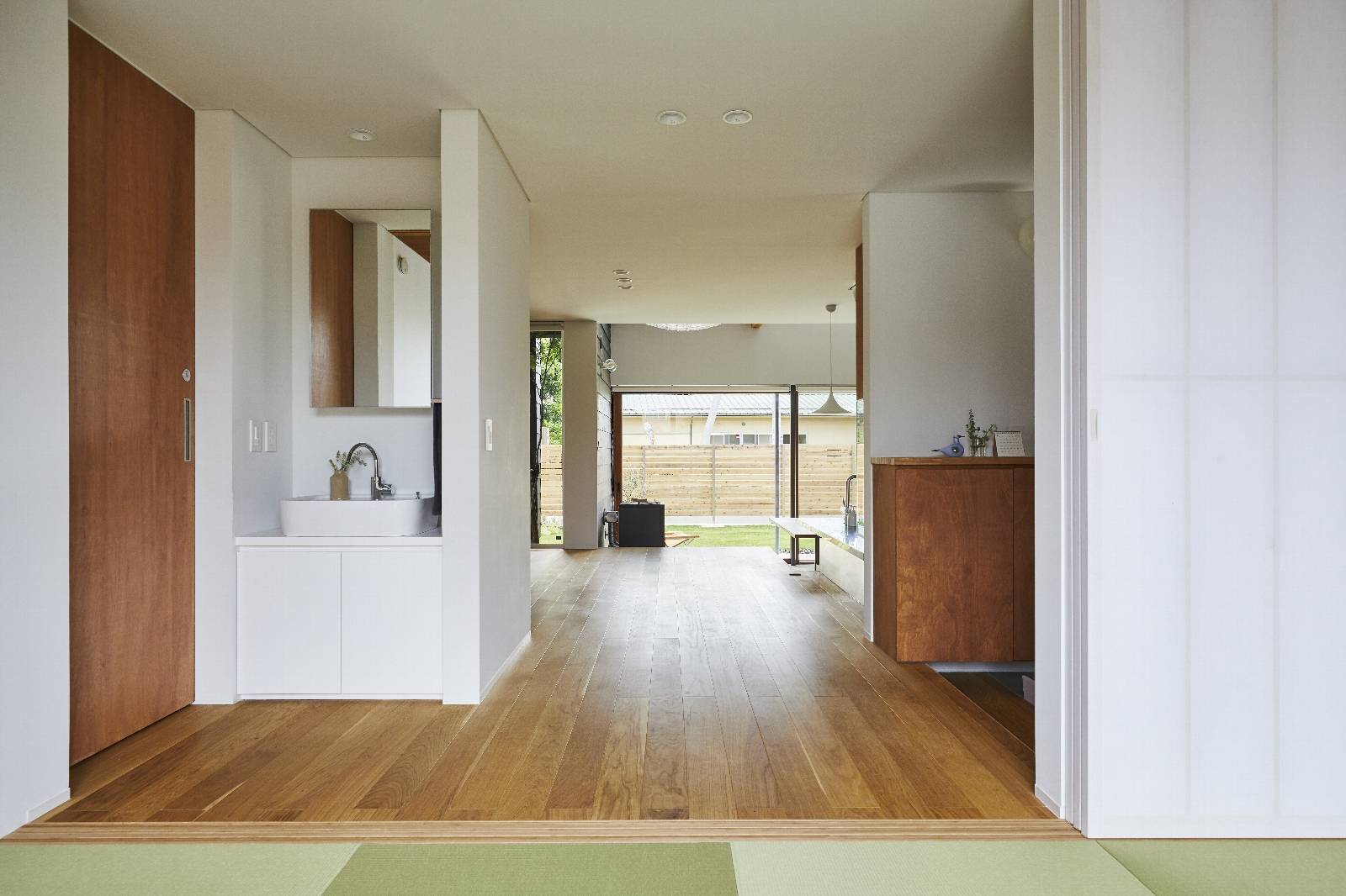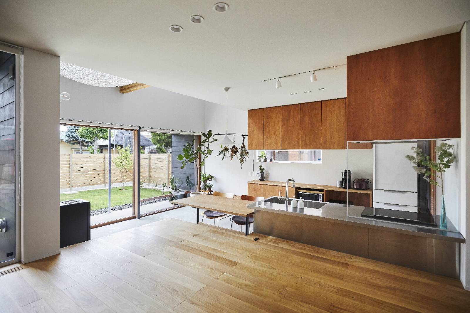 内部空間は、かつて日本海側雪国の町屋建築にも見られた『なか土間』形式とし、玄関の土間をキッチン・ダイニング・セカンドリビング(土間テラス)、そして庭へと連続させている。南面に面した土間テラスには間口2間半の大開口を設け、南面の庭への視線の抜けと南北方向に風が建物を通り抜ける計画とした。この「なか土間空間」は外壁のSOLIDOを内部にも連続させ、内外を一体的な空間として計画している。