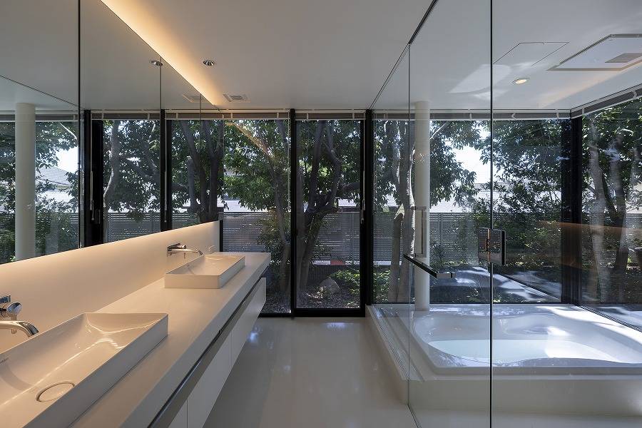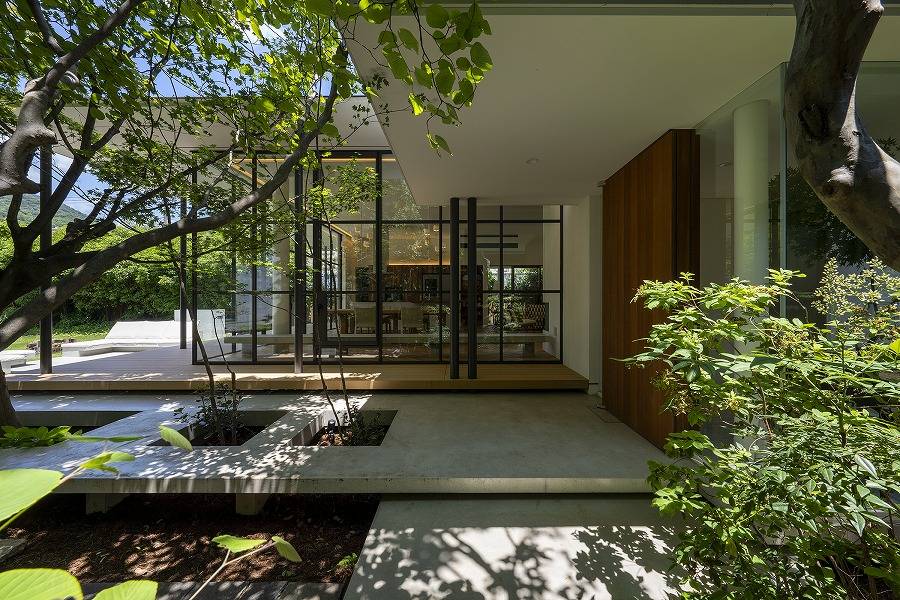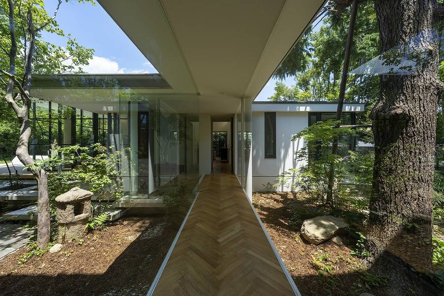 その先で秋には紅色に染まるイロハモミジとコハウチハカエデのトンネルをくぐると、母屋と蔵の玄関、それらを結ぶガラス張りの渡り廊下に突き当たるが、視線はガラスの先の中庭へと抜け、そこもまた秋の紅葉が華やかドウダンツツジとシンボルとなるヒマラヤスギの高木が出迎える。