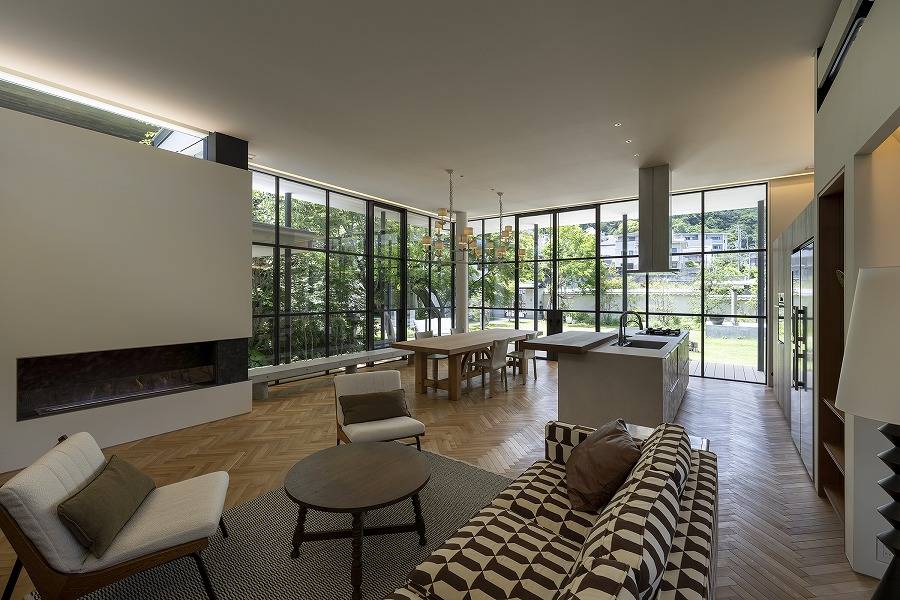 敷地全体が築地塀の風合いで囲まれ一定のプライバシーが確保されていることから、通常では困難な大胆な開放性を持つ建物とし、お子様やご家族がいつも庭や自然と繋がっていられるようなプランが実現された。