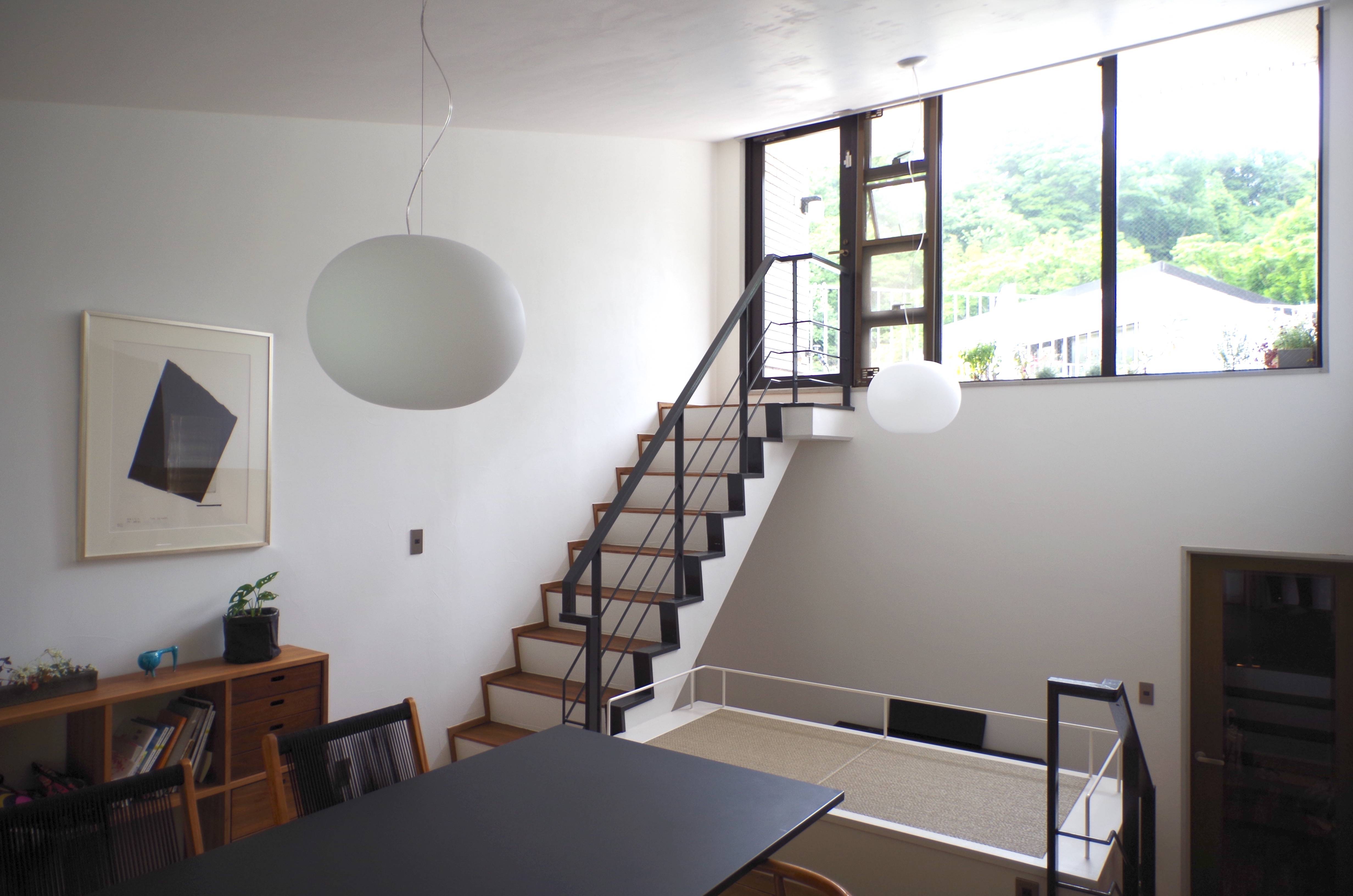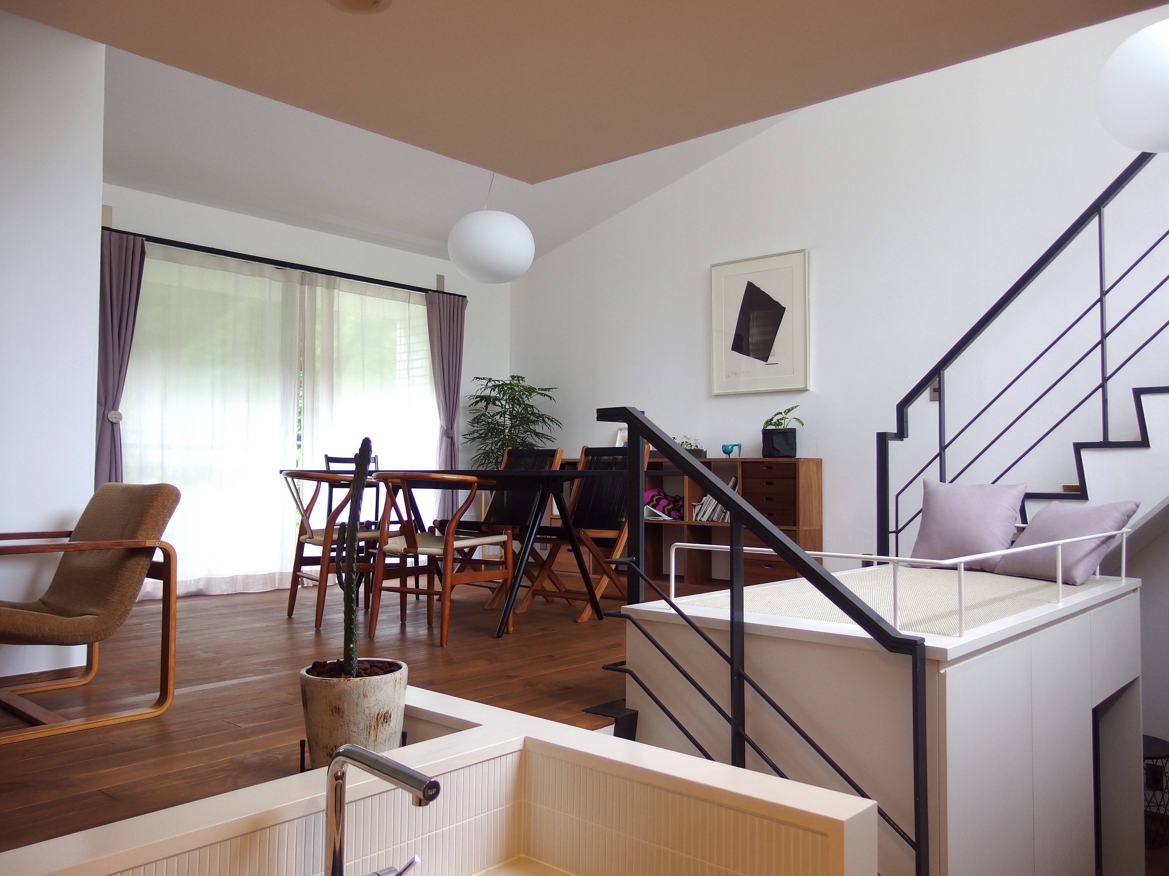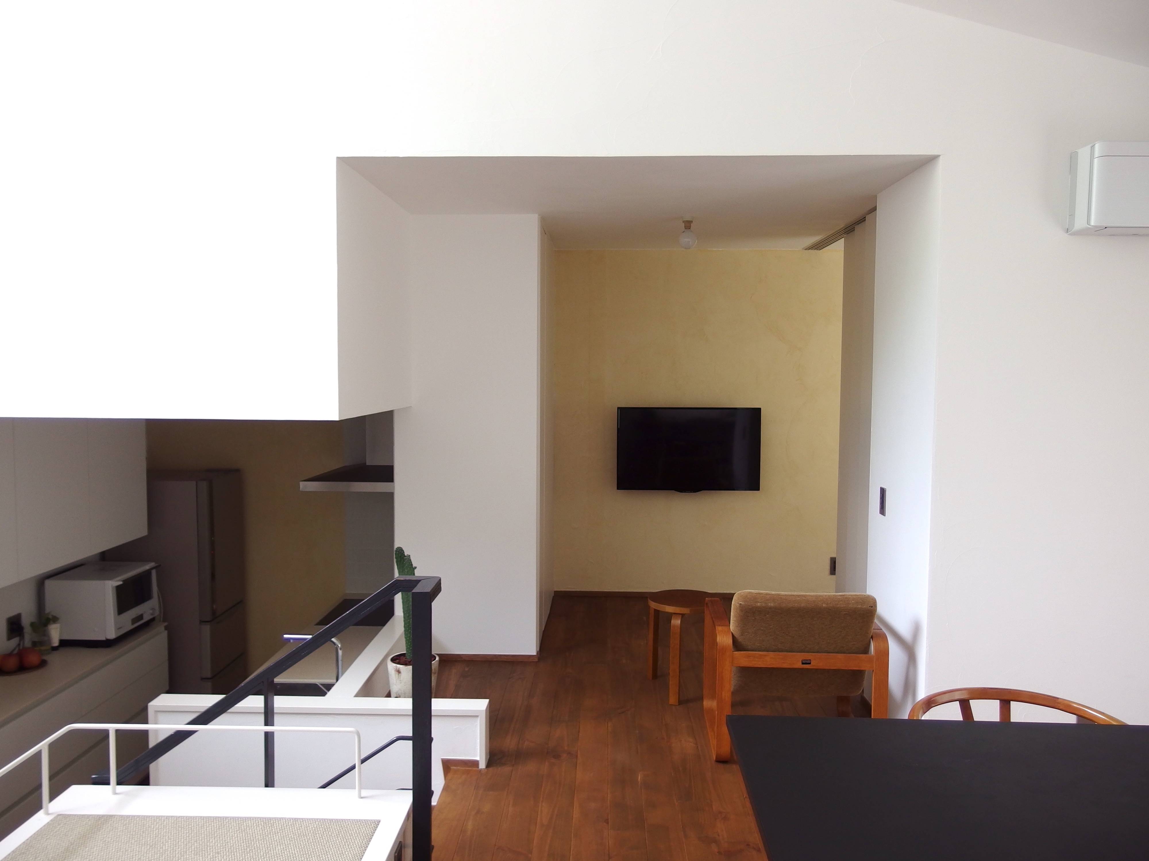 緑豊かな周辺環境の中に低層の住戸が連なる集合住宅の一室。高低差のあるスキップフロア、高天井の大きな空間、東西の上下斜め方向に視線が抜けるなどの特徴的な条件を最大限活かすことが求められた。主空間のボリュームをキッチンと個室の透明なボリュームで穿つようなイメージで空間を連ね、リビング・キッチン・個室がそれぞれの領域を保ちながらもタテヨコに緩やかに連続する平面・断面計画としている。