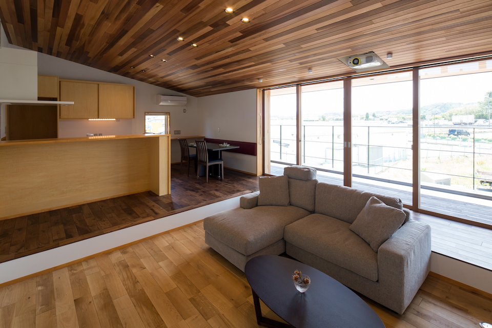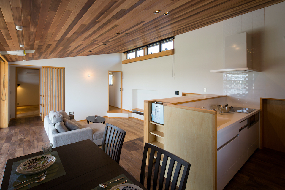 かみてつのいえは、店舗併用住宅です。もっと厳密の言うと店舗併用2世帯同居住宅といったほうがいいのかもしれません。クライアントである子世帯のご家族が、理容室を経営しながらお父さんお母さんと同居して暮らすための58坪の住宅です。 外観は、店舗に必要な非日常感と住宅がまとう日常感とが混在するちょうど良いバランスとなるように配慮しています。間取りには、フルオープンできる木製サッシを開け放てばウッドデッキと室内が一体となる開放的なプランと、高齢者に配慮した行き止まりのない回遊動線を取り入れています。