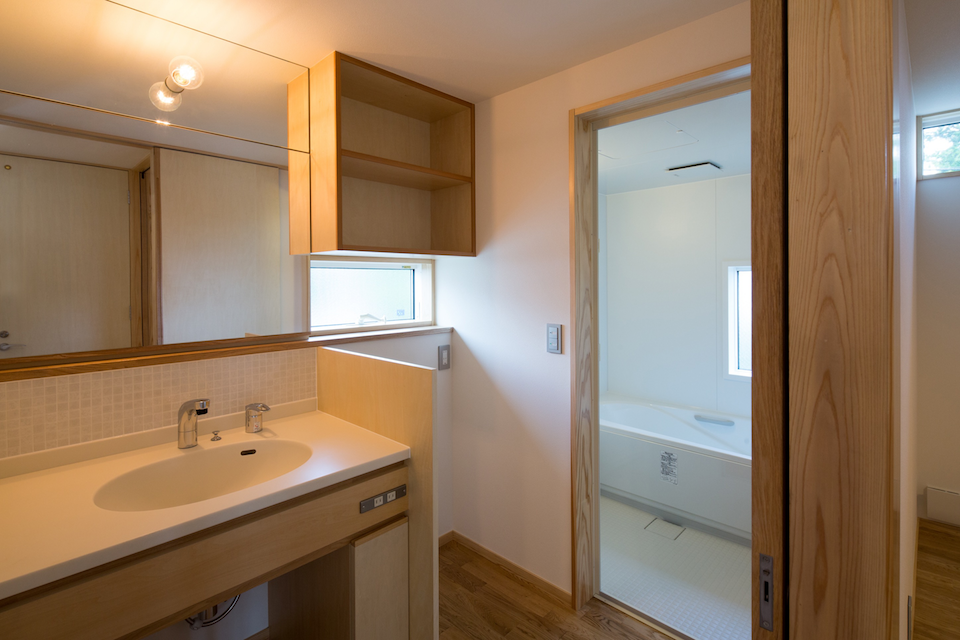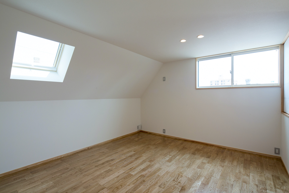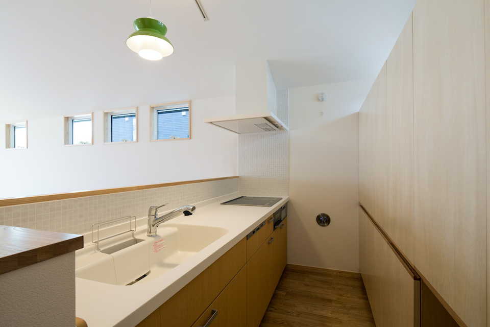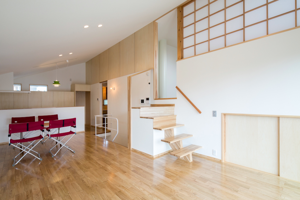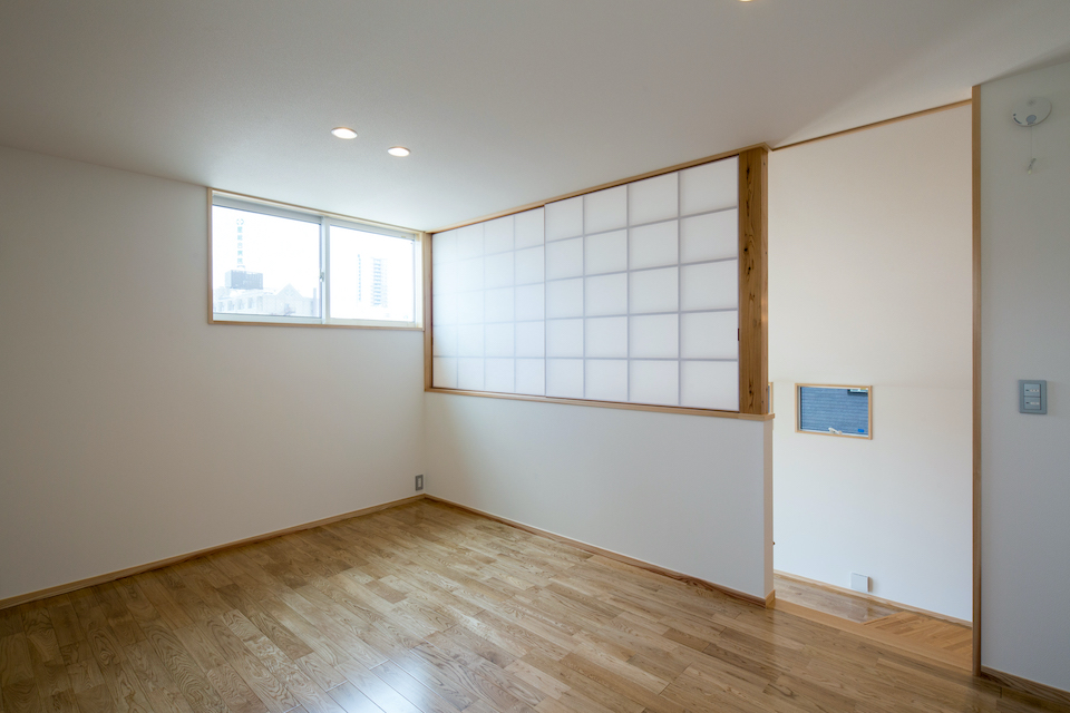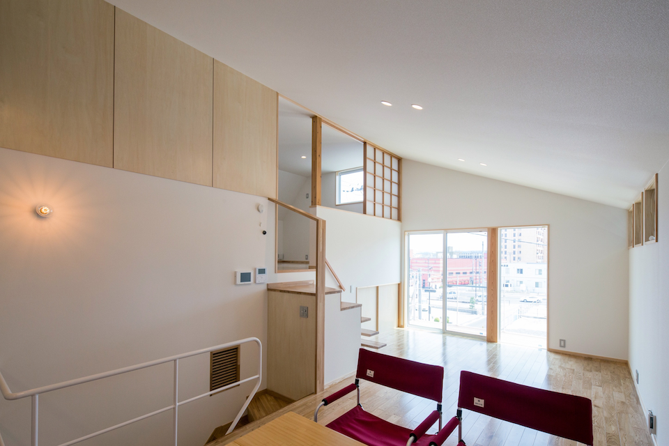 敷地は、東西に長い矩形で、西と北が道路に接し、東は隣地が3m下がった崖地でした。南には、2階建てアパートが計画されており、採光が期待できないことから崖地の高低差を利用した東向きの家としました。 お施主様のご要望は、妻方のお母様とお施主さまご家族(夫、妻、娘)とが、お互いのプライバシーを確保しながら暮らすことができる2世帯同居住宅とすることでした。 具体的には、①飲食店を経営する旦那さまが、日中に静かに眠ることができるようにしたい。②お母様の生活とお施主様ご家族の生活はできるだけ分離させたい。③世代交代しても住みつなぐことができ、近い将来にはカフェを営むことができる間取りと、来客用の駐車スペースが欲しい。④風水を考慮して、門を北向きに設け、子供部屋は東側にしたい。というもので、お母様とお施主様ご家族の生活スペースを階別に明確化し、1階には、お母様の空間を玄関近くに設けることで、世代交代後に客間として機能するようにし、カフェへの転用を考えたフリースペースと駐車スペースを補うビルトインガレージを設けました。2階は、東側に子供部屋を設け、スキップフロア構成とすることで広がりを与えています。