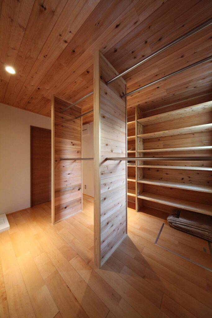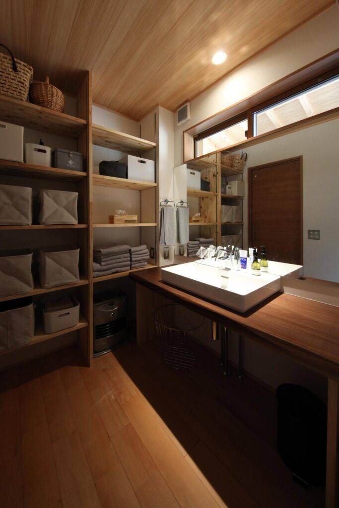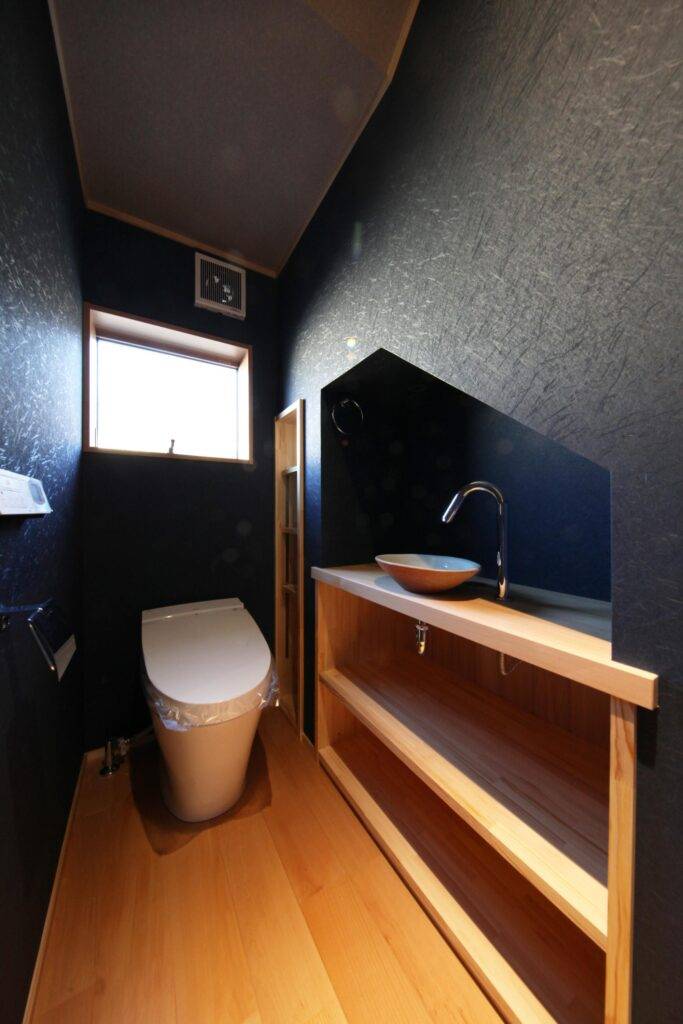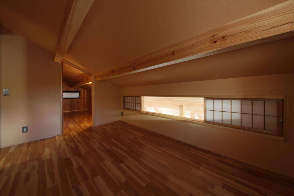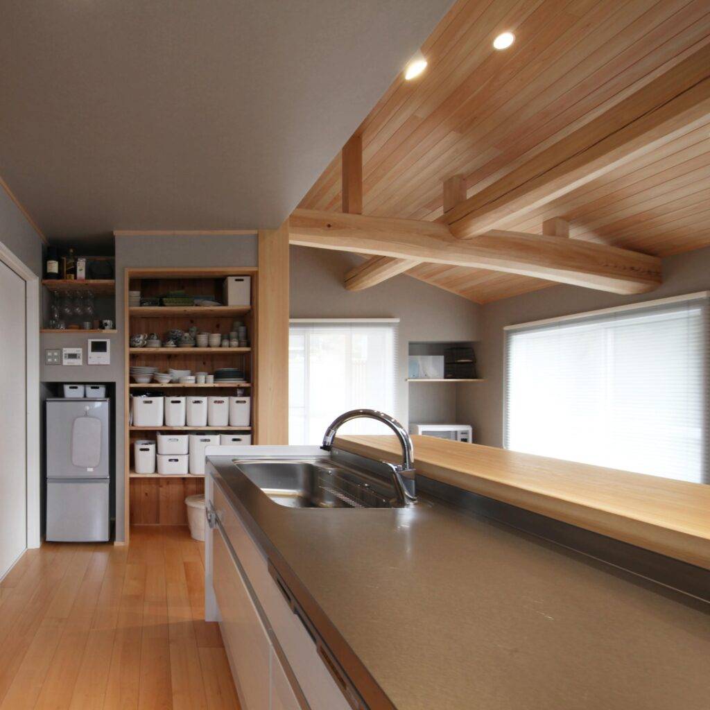 チャーミングな外観のグレイ色の家です。ぱっと見は平屋のように見えますが、実は2階建てです。軒の出が深くてシンプルな形状が、周辺の竹林の風景と馴染んでいい雰囲気が出ています。
