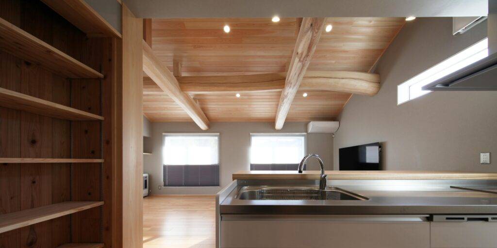丸太組みの手刻み加工の動画に出てくる丸太は、このGRAY HOUSEの丸太組みです。グレイ色のリビングにも丸太組みはよく馴染んでいます。広すぎず狭すぎずという、ファミリーで暮らすにはちょうどいい感じの広さのリビングで、なぜかホッと安心できる空間です。