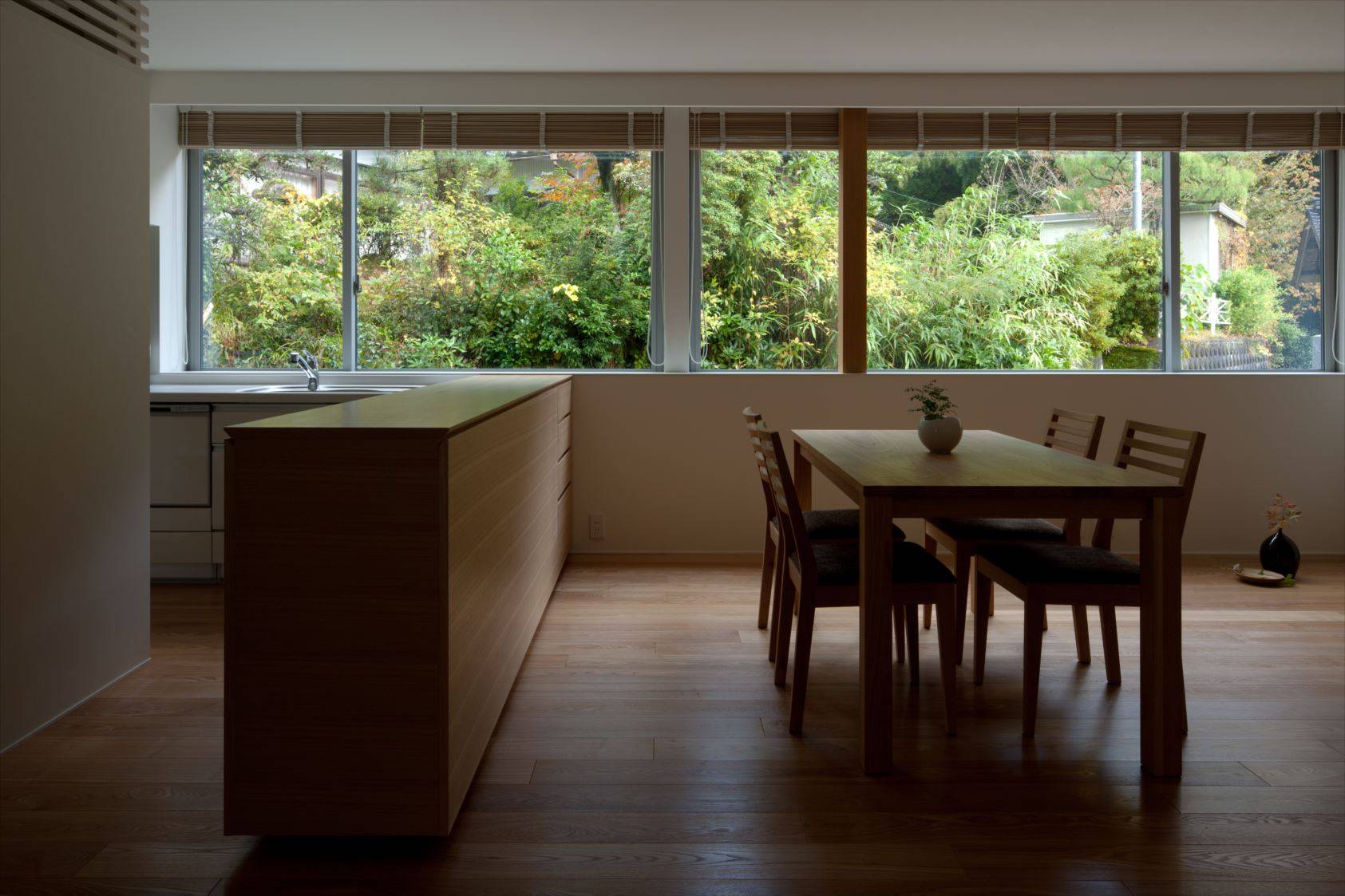 深い森に佇んでいたかのような以前の住宅、その空間が持っていた静謐さや情緒さを継承するような住宅となることをイメージしながら設計しました。外と繋がる窓辺を居心地いい居場所になるように、開口部や窓台に工夫をしました。