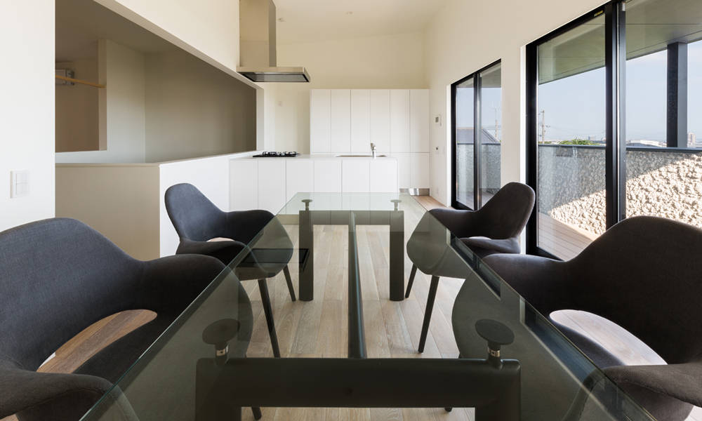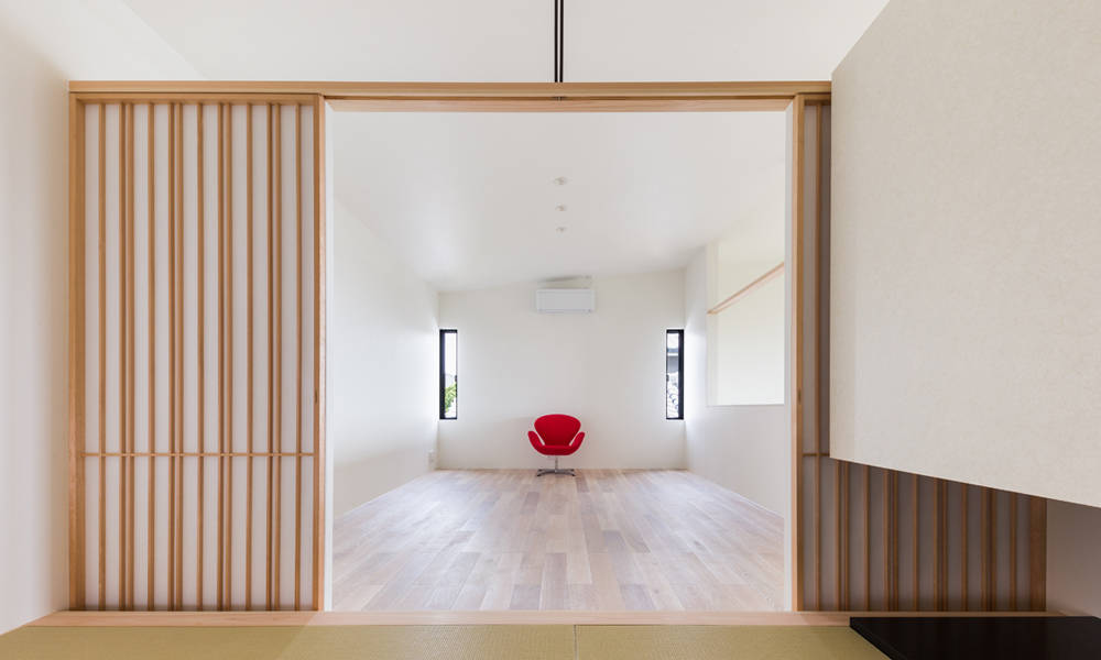 2Fは北側がリビング、和室、南側にはダイニング、キッチンとなっており、吹抜にかかるブリッジによってつながり勾配天井も相まって上下左右に視線の抜ける広々とした空間となっている。