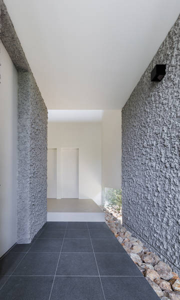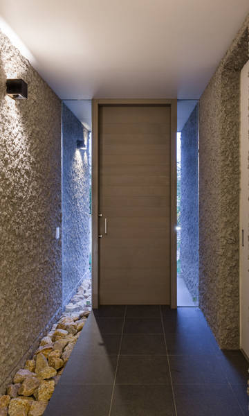 計画では道路に面する前面を緑豊かなオープンスペースとして駐車スペース、アプローチなどを包含した環境を作り上げ、南側に建物をさらに建設出来るスペースを残した。傾斜のある長いアプローチは森に入って建物に辿り着くようなイメージを与えてくれる。