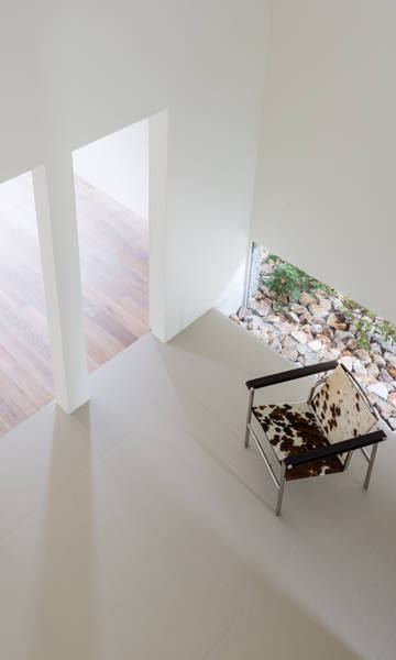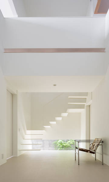 内部空間は建物中央に東西に抜ける2.5m×6.5mの吹抜空間が広がり、さらに地窓によって外部まで視線が広がる。1Fは吹抜を境に北側には子供室、水廻り、南側には主寝室の各個室が繋がる。吹抜けには片持ちの鉄骨階段がコの字状にまわり、吹抜と一体となり、上下階を繋いでくれる。