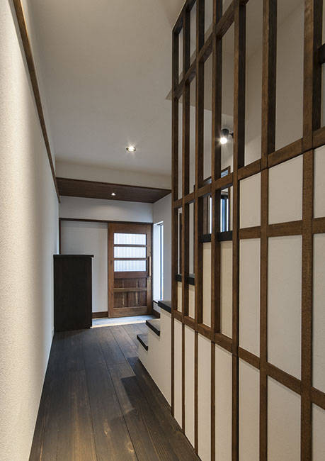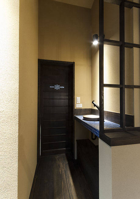 家の中には玄関を始め各所に古建具を使用し、1階リビングの襖紙、2階トイレの竹ルーバー天井や小石の入った土間、2階手洗いスペースの柄入りの円形モザイクタイルなど個性ある素材を家の中に配して、暮らしに彩りを与えています。