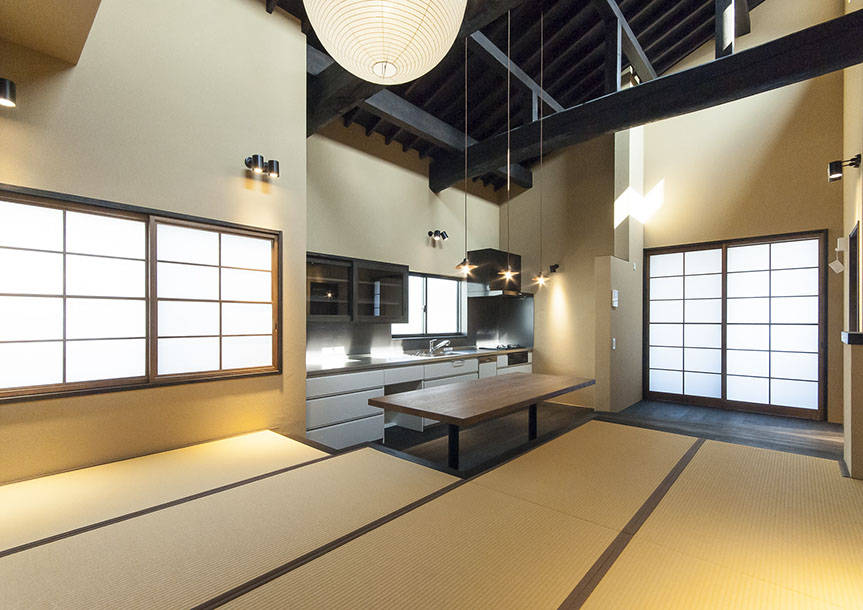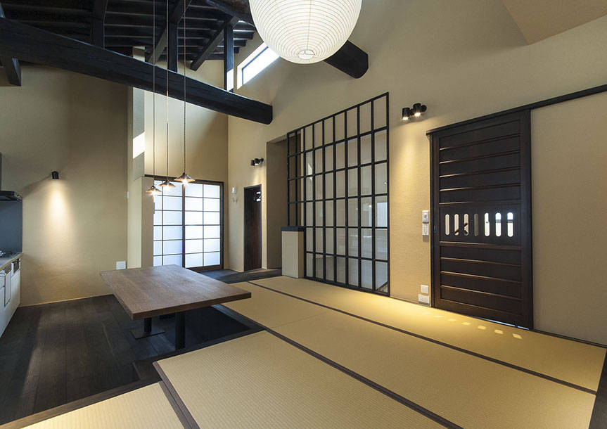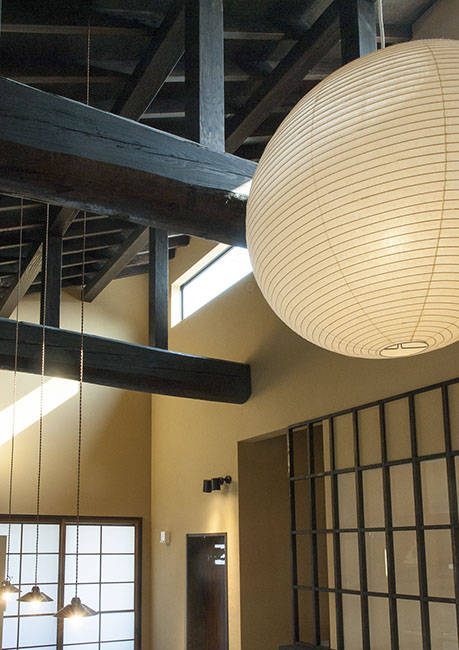 この歴史ある街に、イサムノグチがデザインした大きな提灯が下がるリビングを持つ、新築なのに古民家の雰囲気を持つ住宅が出来上がりました。