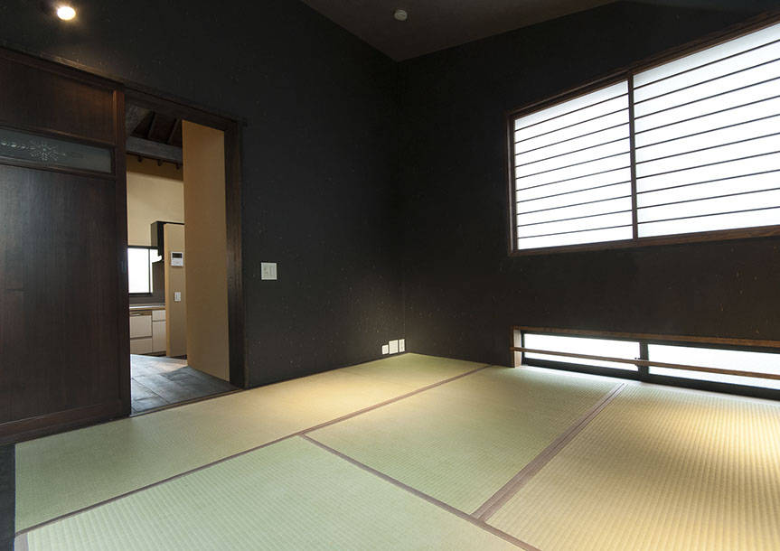 リビングダイニングは全てタタミ敷きにしました。ただし利用頻度と耐久性を考えて、あえて本物の畳ではなく、紙で出来た耐久性のあるタタミを使用しました。畳本来の匂いこそしませんが、見た目はかなり本物に近い感じになっています。キッチン側はフローリングを敷き、立って使用できるように1段下げて設計しています。ダイニングテーブルは造り付けとし、甲板には厚み45mmのナラのハギ材を使用しました。厚みがある為、かなり迫力のあるテーブルになっています。