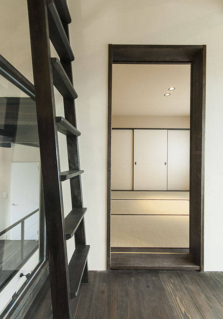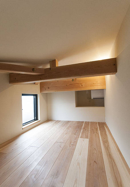 寝室は、子供スペースより半階上がった位置に配置し、プライバシーの高い空間としました。畳を敷き、開口部の外には肘掛手摺を設けています。また、家のてっぺんには富士山を望む小部屋を作っています。
