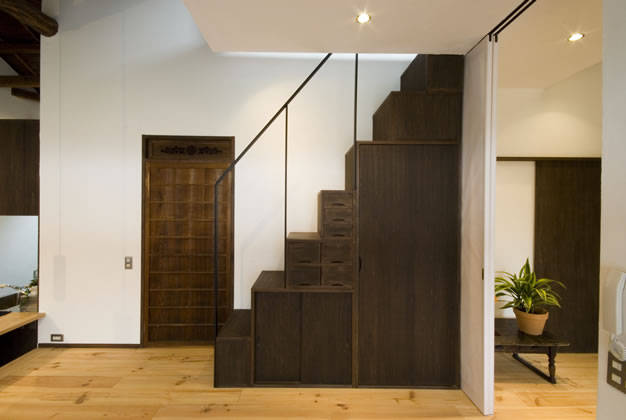 リビングの主庭に面した窓には、以前縁側に使用されていた障子を再利用しました。ロフトスペースに上がる為の階段は、伝統的な箱階段にしました。箱階段の収納は、リビング廻りの雑物が収納しやすいように細かく分かれています。