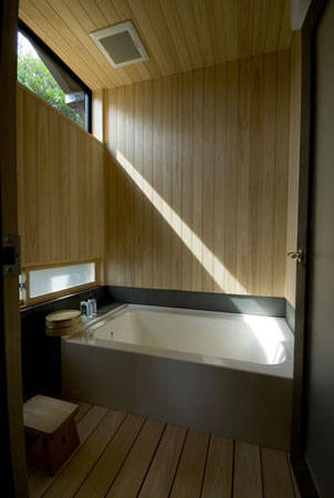 裏庭に面した浴室は、ユニットバスにはせずに、在来工法で作りました。壁はひのき材でつくり、床には御影石を用いました。