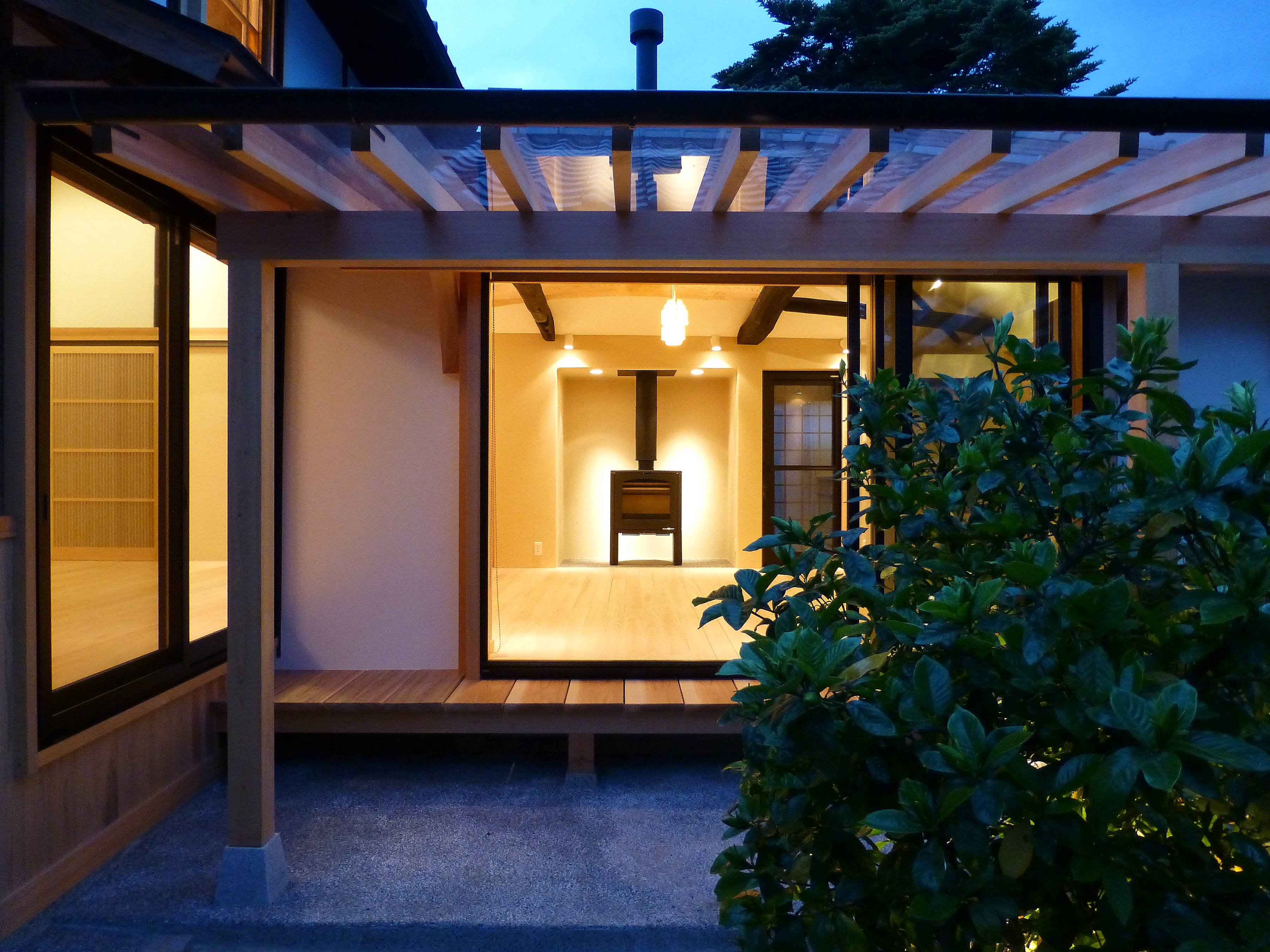 築後90年以上経過した古民家を再生しました。 瓦の葺き替えから始まって、リビング、ダイニング、広縁、玄関廻り、浴室、洗面所、トイレとほぼ全面的な再生となりました。 デザイン的にはモダンな要素を取り入れ、「ガラスの屋根」や「トップライト」、「薪ストーブ」、「色ガラス」や「引き込みの建具」など、生活に潤いを与えることができるよう工夫しました。