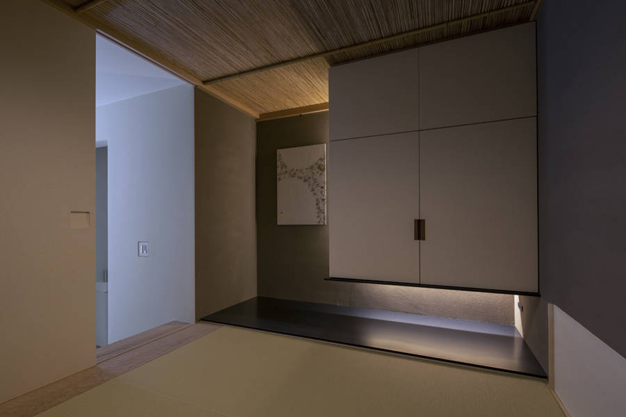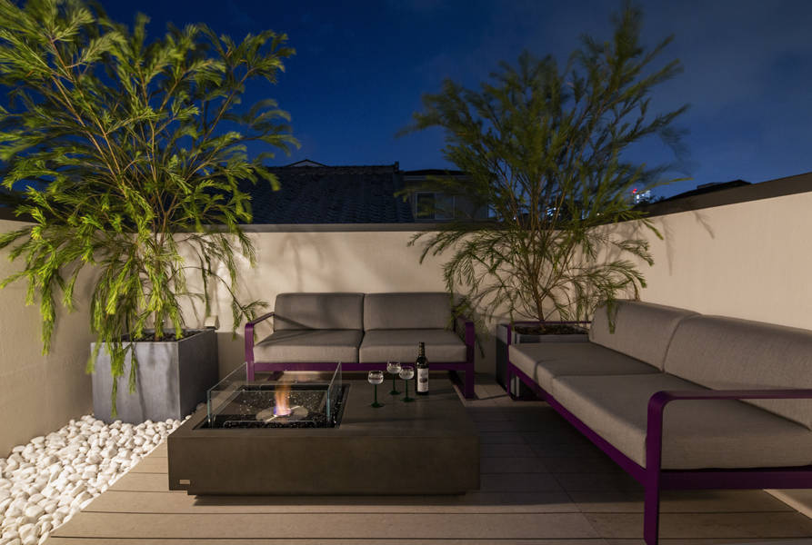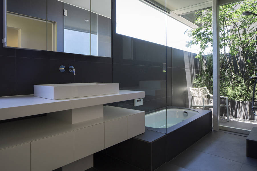 2階浴室はテラスと引戸により一つながりの空間とし、花壇の樹木を眺めながら湯船につかる事ができるプライベート空間となった。さらに2階から階段を登り、開閉式のトップライトを開けると一気に広がる空の広さに一瞬息を飲む。空と四季折々の箕面連山だけを切り取るこだわりの屋上である。ソファに腰を掛けお酒を傾けながら、エタノール暖炉の炎と自分達だけの絵画の様な景色を眺めながらゆったりと流れる時間を家族皆で楽しんで頂きたい。