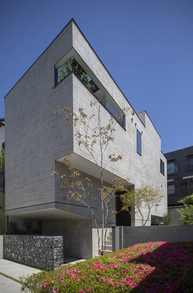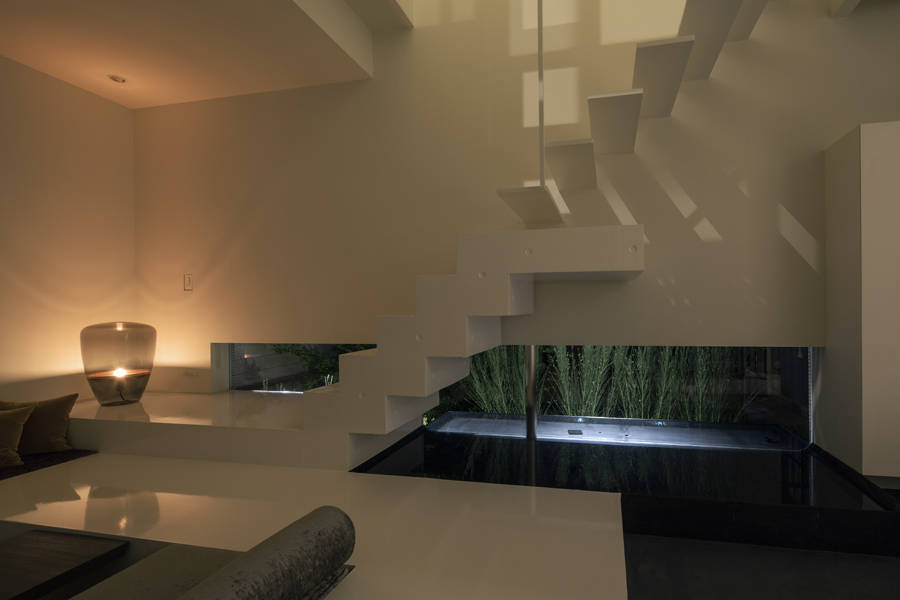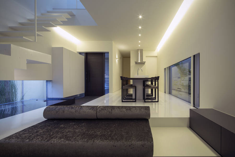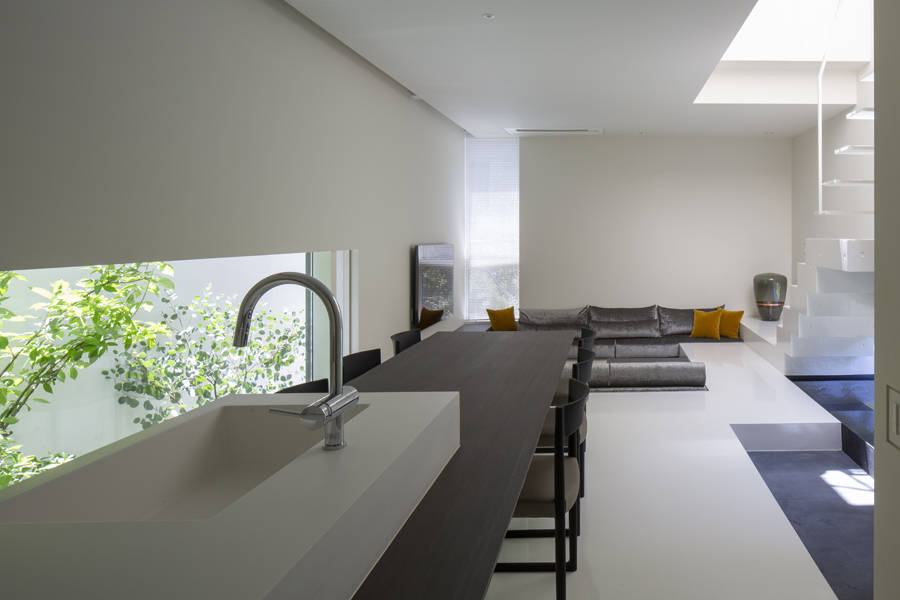 プランは将来、隣地建物が建った時にも十分な明るさを確保出来るよう吹抜け空間に、壁跳ね出しのストリップ階段、上部に大型のトップライトを設ける事で、明るい陽射しが1階まで降り注ぐ空間構成とした。階段の下にはガラス1枚を挟んで外部と繋がる水盤を設ける事で、降り注ぐ光のリフレクターとして、時のうつろいと、光・風のゆらぎを壁や天井に映し出す。