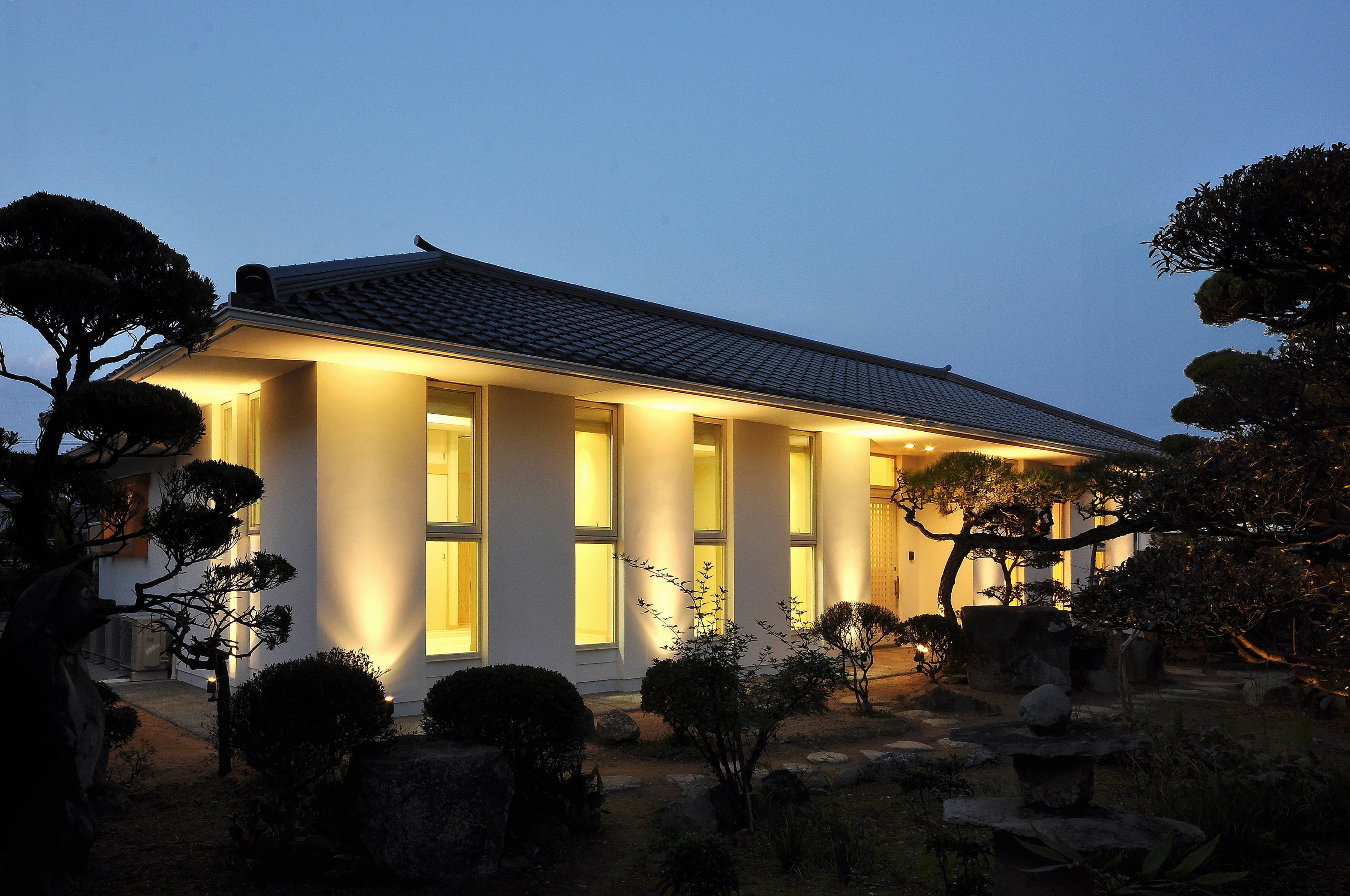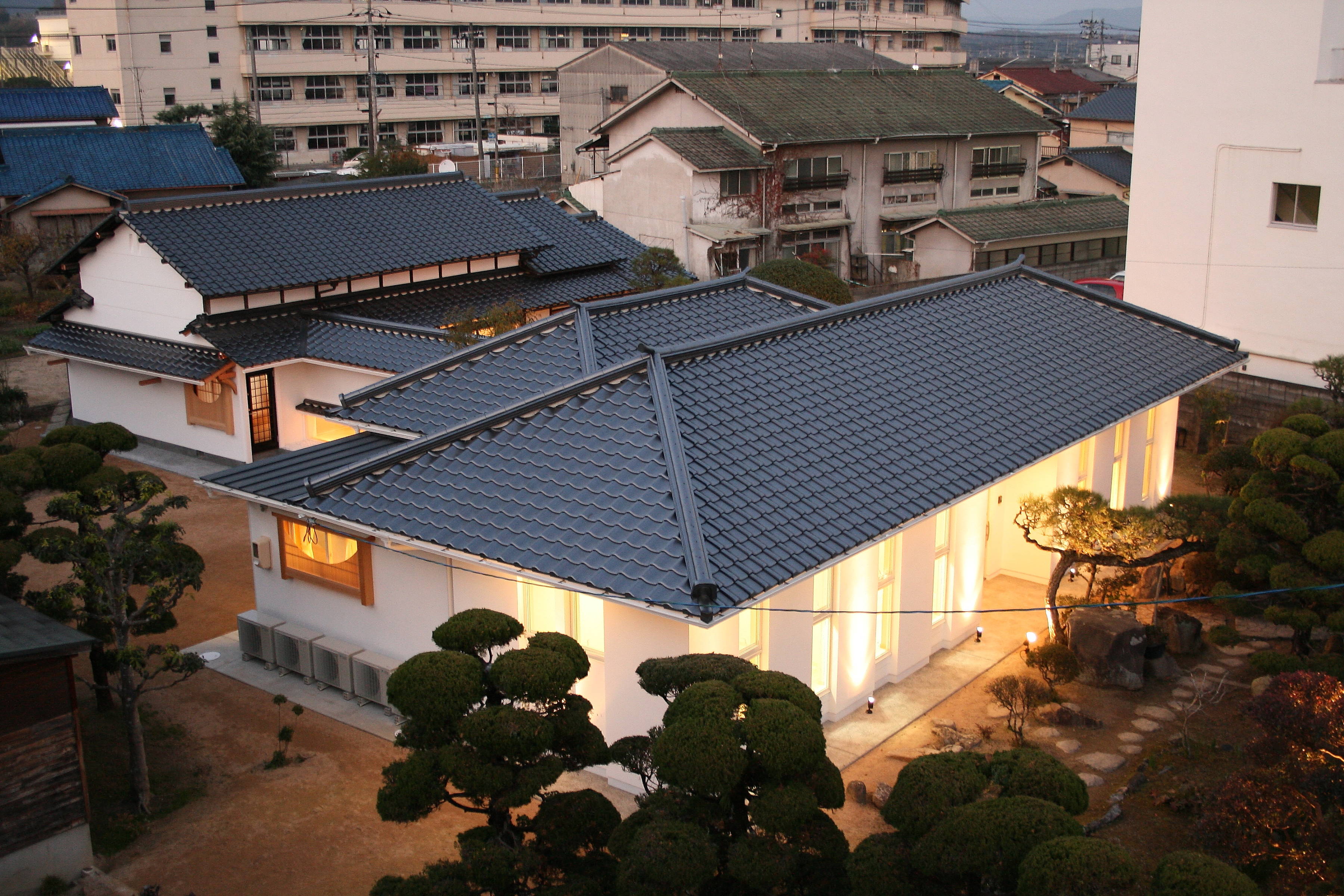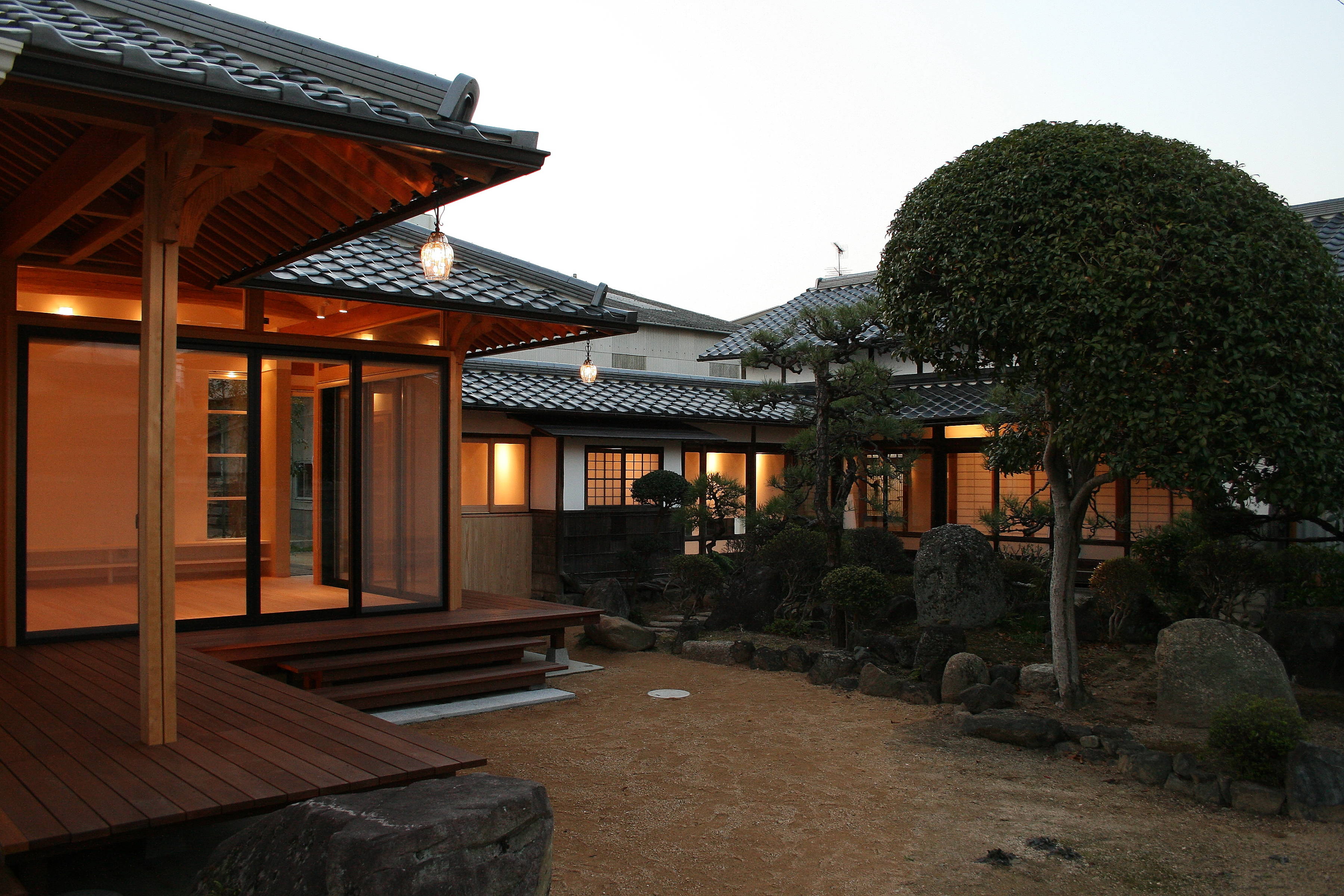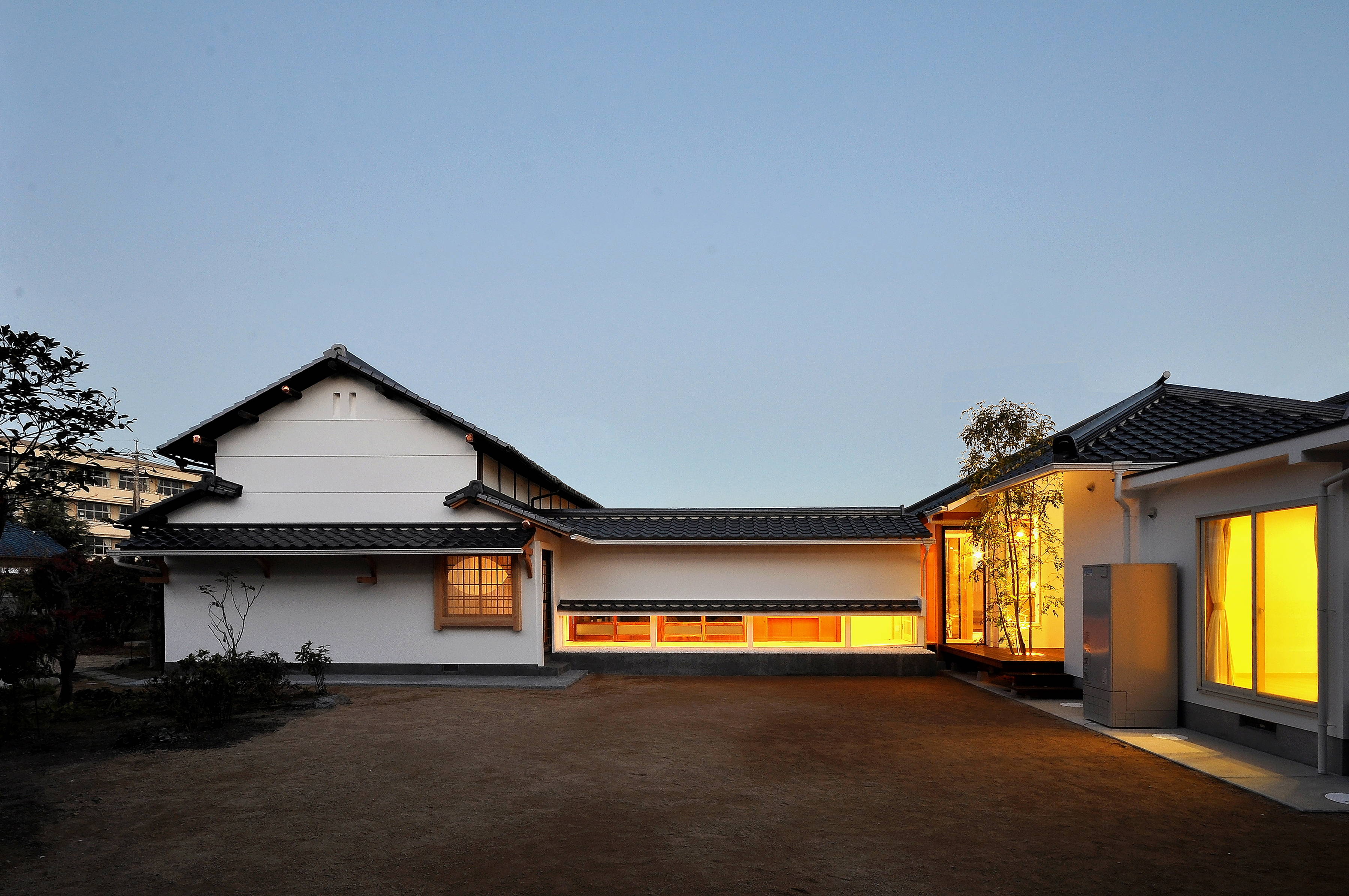 500坪を超える広い敷地に平屋の棟が連なります。古民家再生部分と新築部分が渡り廊下でつながれており、残すべきところは残し、新しくすべきところは新しくしました。 庭を愛で、庭と一体になれるように。 家の歴史を引き継げるように。 長年培ってきた古民家再生のノウハウを注ぎ込んで、解体から始まって、設計に9ヶ月、施工に1年3ヶ月の歳月を要しました。
