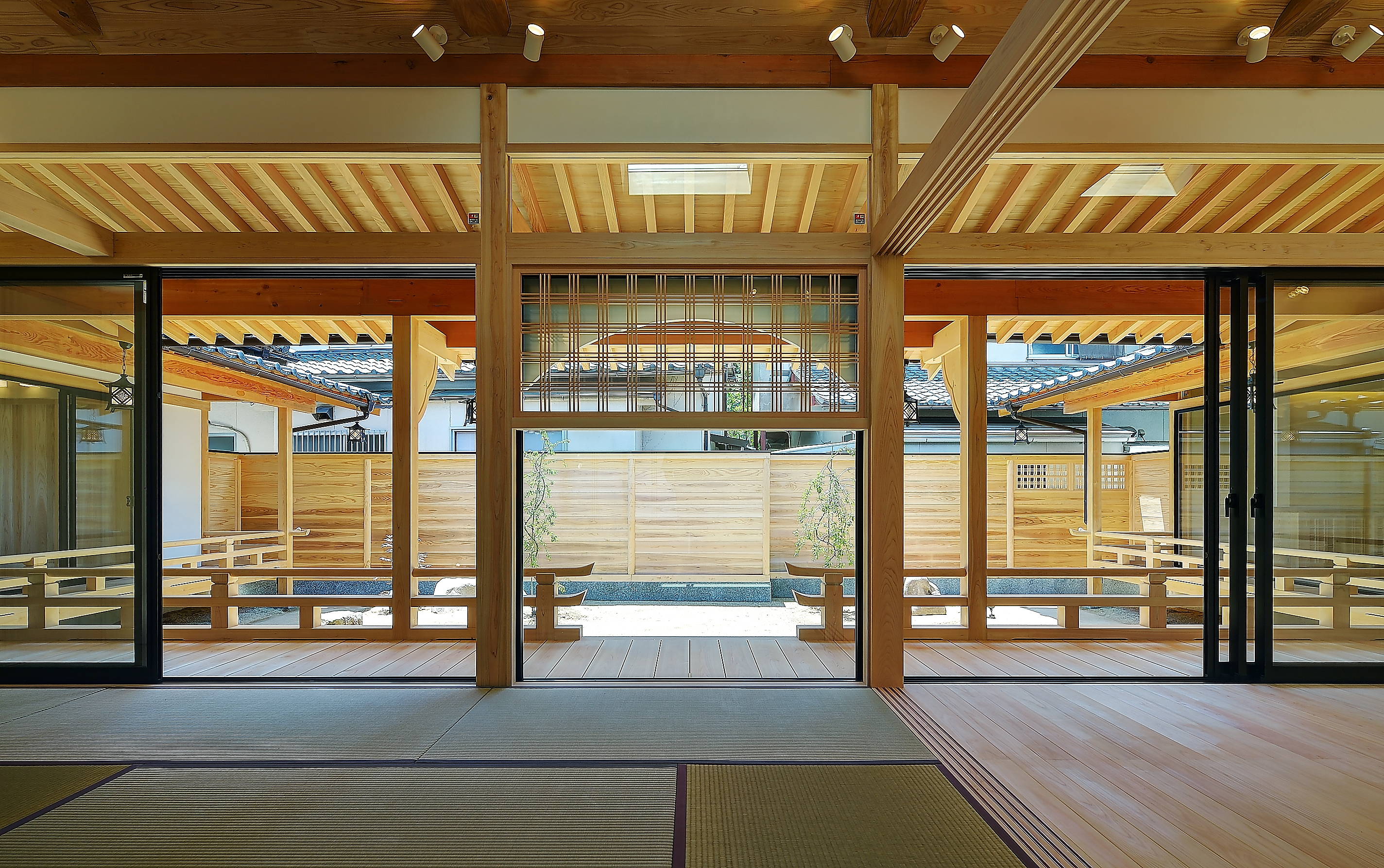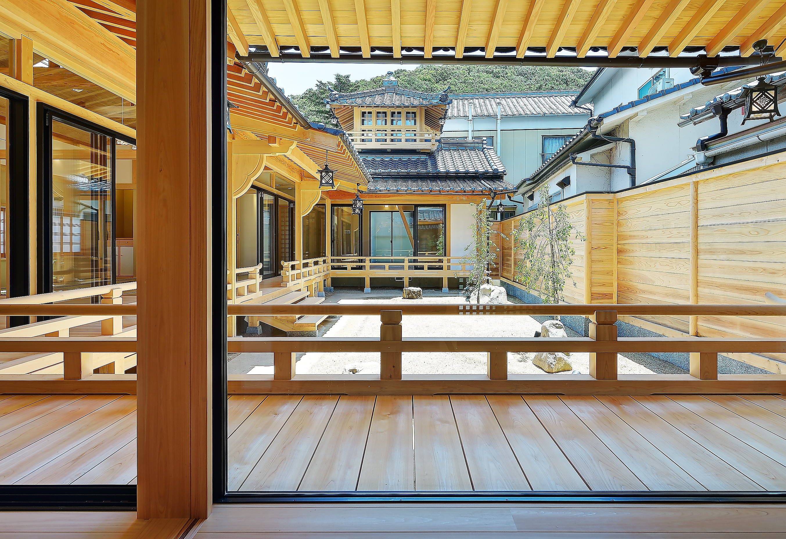 平安時代の建築様式、寝殿造りをイメージして設計しました。回廊が庭を囲み、棟が連なります。 広縁、廊下、欄干等は全てヒノキで、その他材料も厳選したものを使用しています。主なところはケヤキを使用しました。 壁や天井は左官による漆喰、珪藻土仕上げとしています。 玄関は列柱のデザインとし、建物に相応しいアプローチとしました。