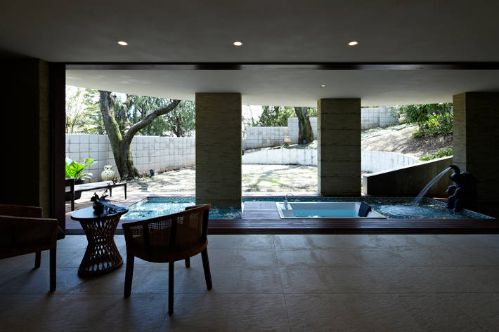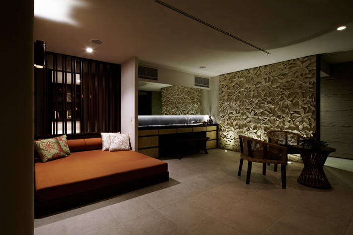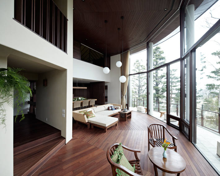 オリジナルに拘り、照明から家具にいたるまですべてデザインしバリで製作したり、伐ったケヤキを製材してカウンター材や手摺材の材料とし再利用するなどし、色々と拘ってデザインしたものがこの住宅を盛り上げてくれる存在にもなっています。床材もバリに視察に行き仕入れるまで行うなど、普段あまり味わえない様々な経験をする事が出来ました。こういった環境の中で細部に至る拘りを行える設計機会をもうけて頂いたクライアントに感謝しています。