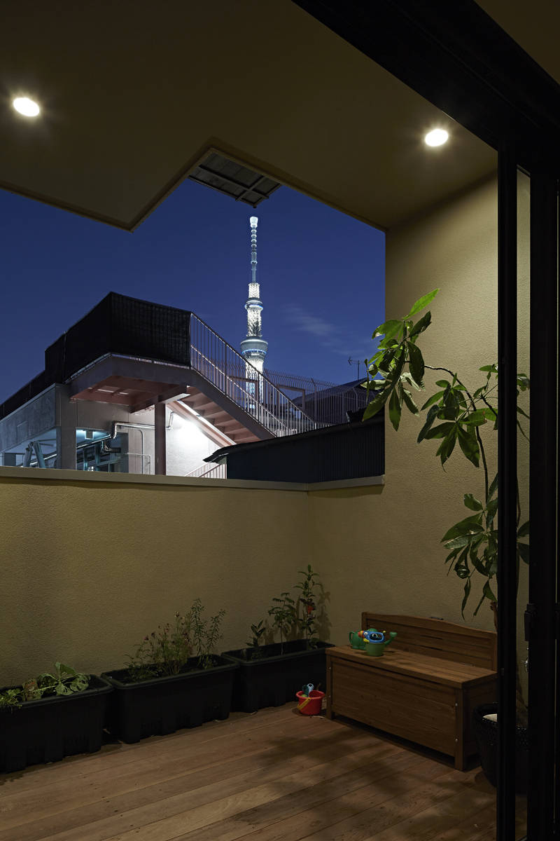 そこで、空間構成にスキップフロアとし、レベル差を設ける事で様々な質の違うステージをつくり、そのいくつかのステージから違ったスカイツリーが現れるようにしました。そして最上階にある物見櫓から何かのエンディングかのように最高のスカイツリーが望めます。一見それは最後のように感じますが、住まわれる家族にとっては1ステージであり序章にすぎないかもしれません。これから家族は様々なステージをどう楽しまれ過ごされるのでしょう。そして古来からの建造物である物見櫓と最新の建造物である東京スカイツリーはどのような時間を積み重ねていくのでしょうか。