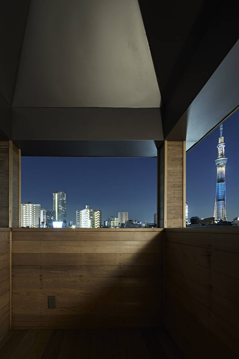 東京スカイツリーより程近く、計画次第ではそれを室から望むことの出来る羨ましい敷地でした。スカイツリーをどう望むか、またスカイツリーとの関係性をどのように意図するかがポイントとなりました。また隣地にも囲まれているためすべての箇所からは望む事はできなく、その望める場と全体の空間との構成も重要であると考えました。