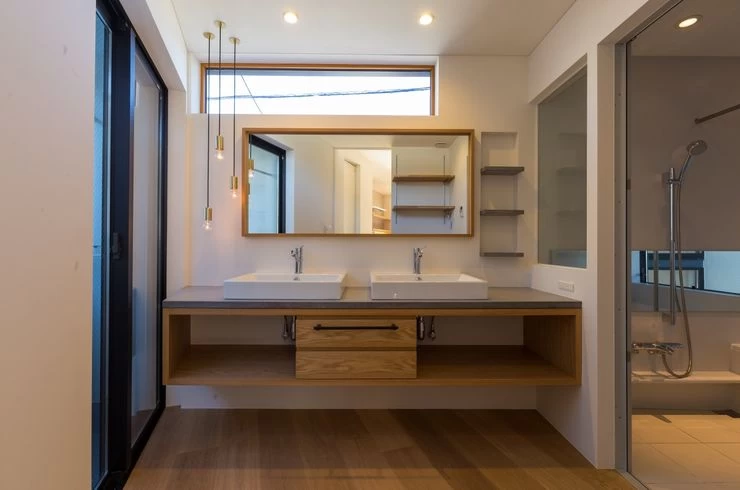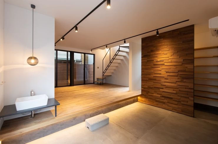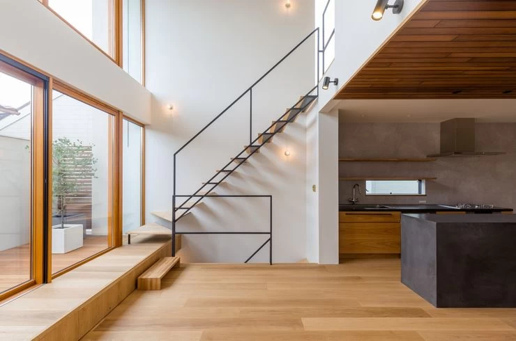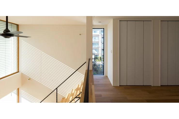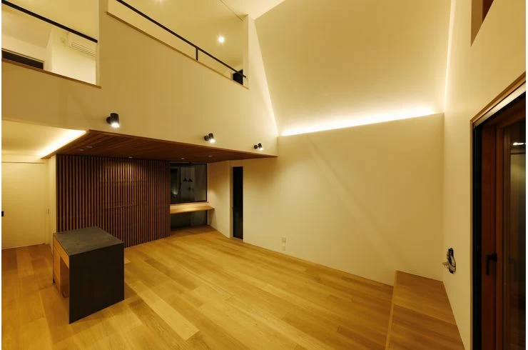 1階は玄関として、町屋のように腰かけることができる土間のあるワンルーム空間。2階南に吹抜けを設定し、軒までフラットにつながる天井と、高さ目一杯の窓。屋外ブラインドを設け、日差しから内部を守り、ブラインドがつくる影で光を愉しめるように。随所に間接照明を仕込み、柔らかい光で壁と天井、床との接点をフワッと和らげて、ホテルにいるような落ち着きを感じるように。