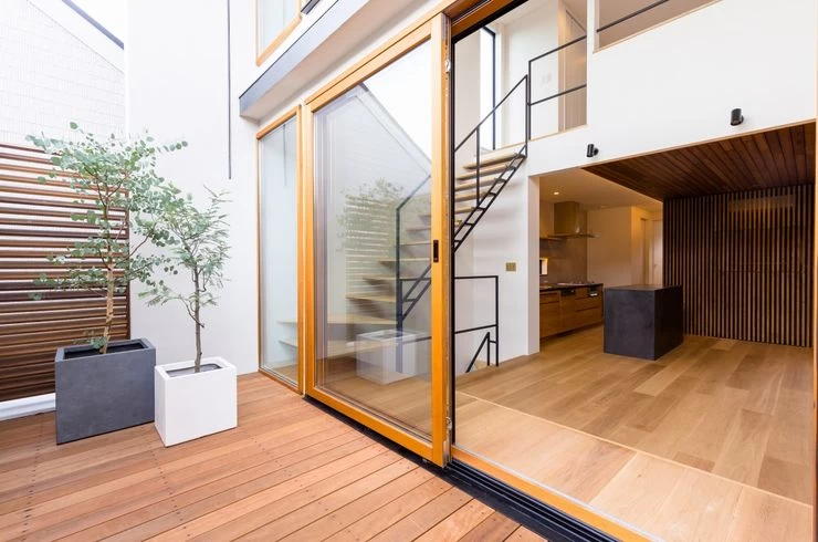 敷地の不整形部分に大きな袖壁を設け、アプローチ上部に屋外吹き抜け空間をつくりました。それが外観の特徴となり、また内部では前面道路との距離をつくります。開放的だけど、奥まった場所にいるような安心感をつくり出す壁です。