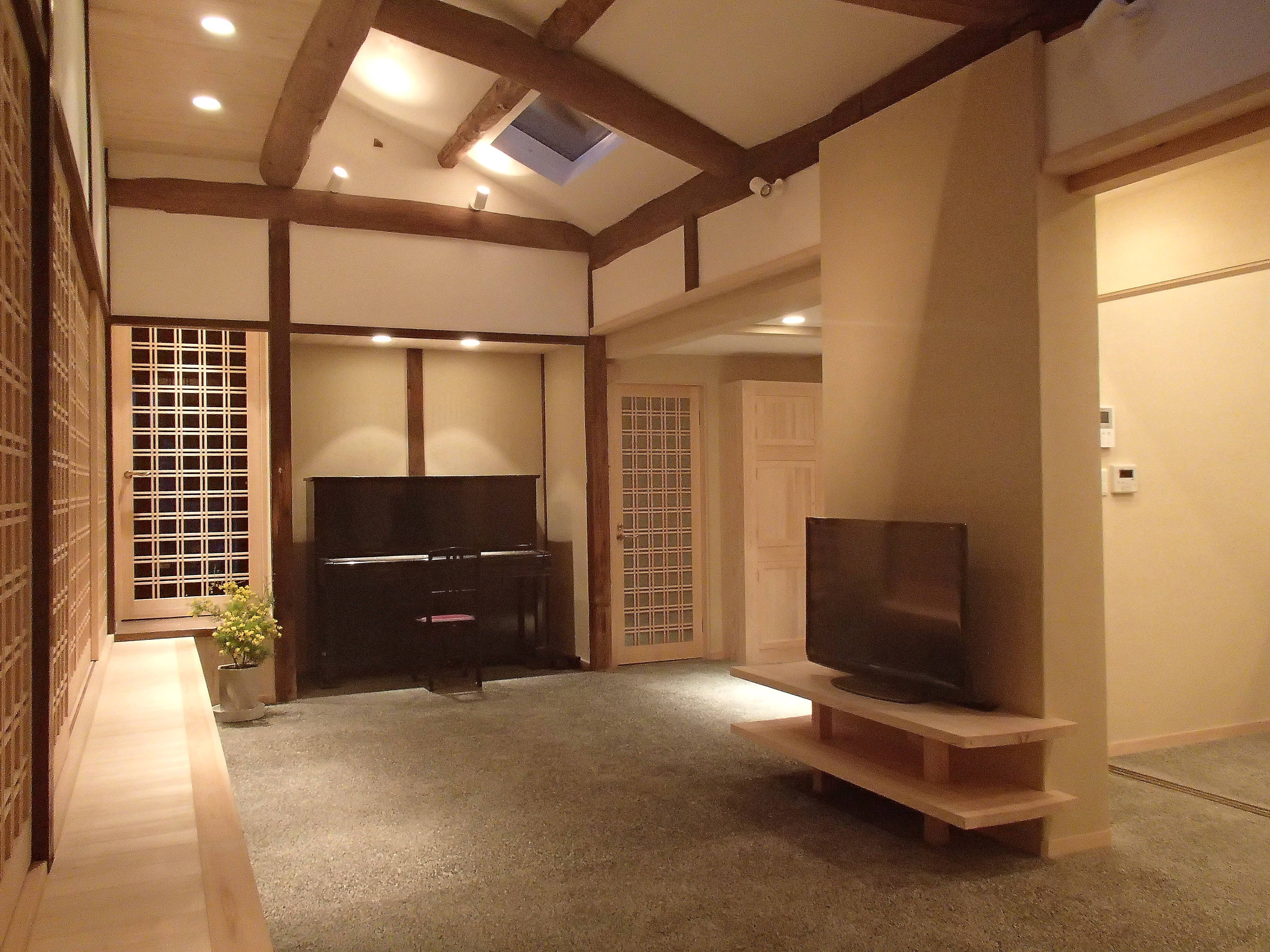 築後100年以上経過した古民家を再生しました。母屋、東離れ、釜屋、蔵、塀と全面再生を行いました。 古民家の特徴である『座敷』を残しつつ、広大な土間空間と吹抜を創り出し、モダンで明るい空間をデザインしました。 薪ストーブやピアノを備え付け、豊かで楽しい生活空間となる様に工夫しています。