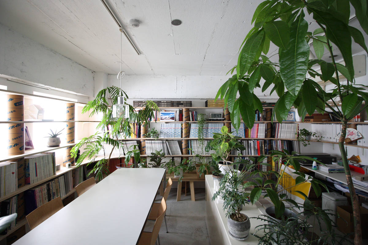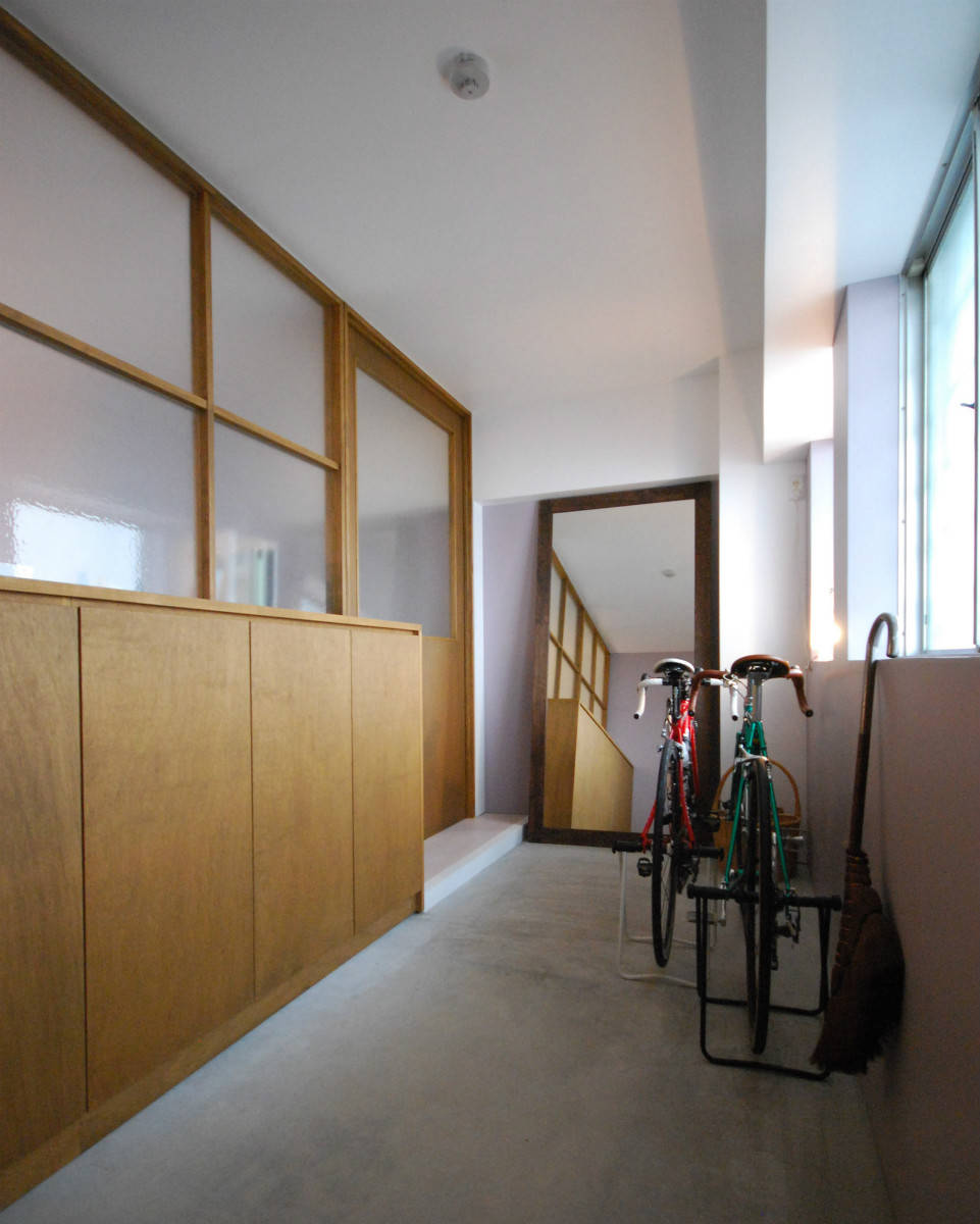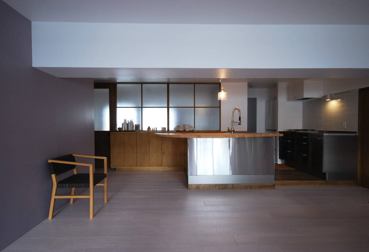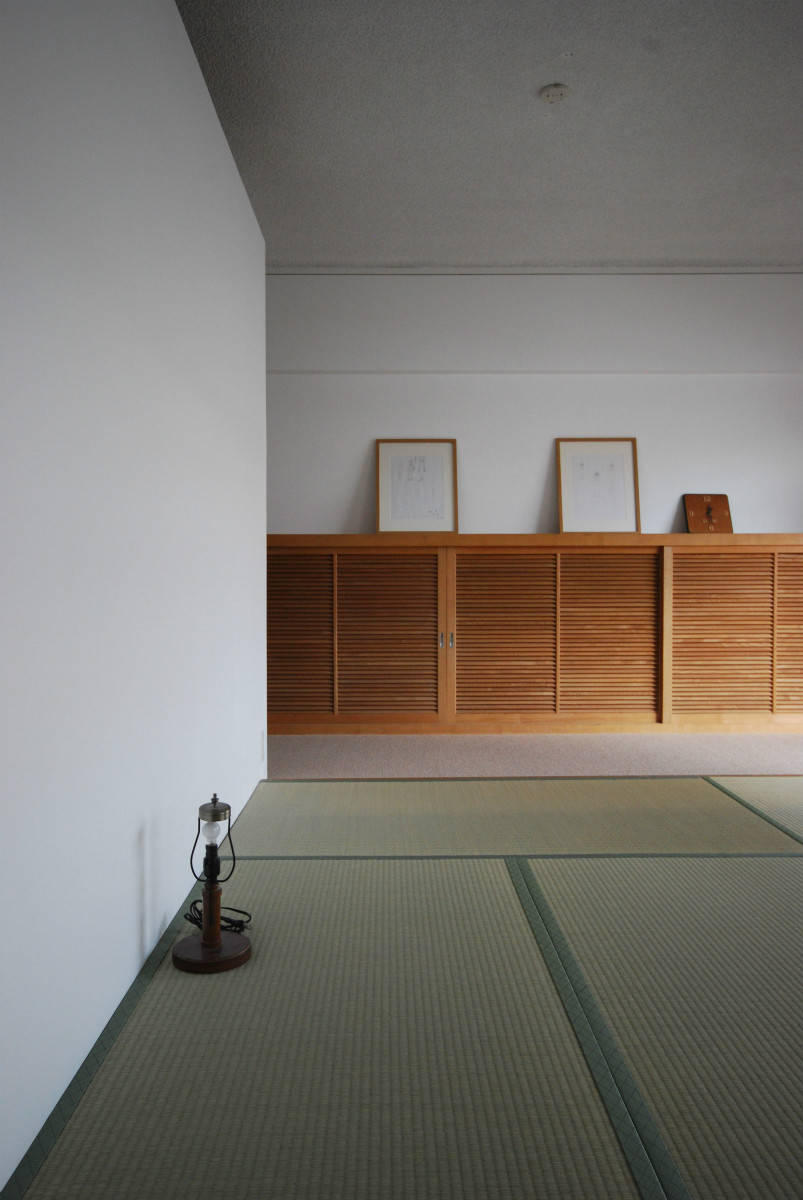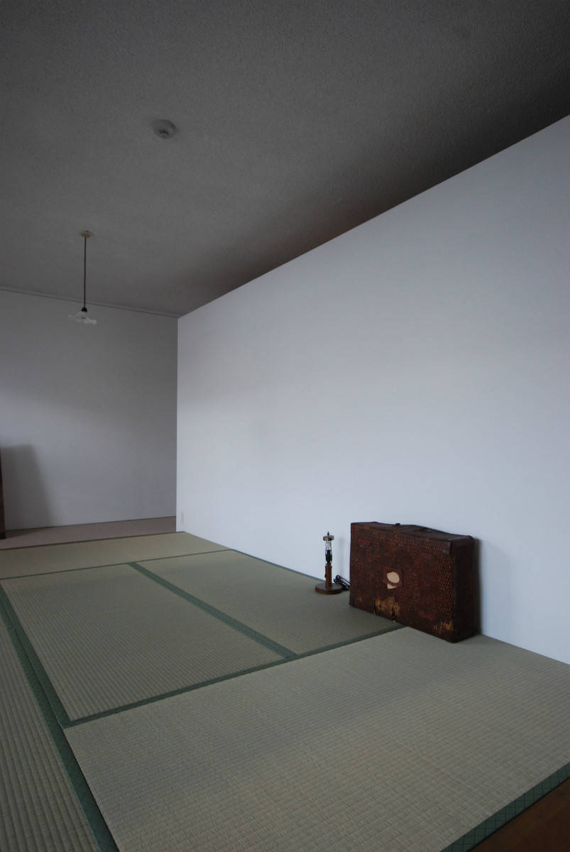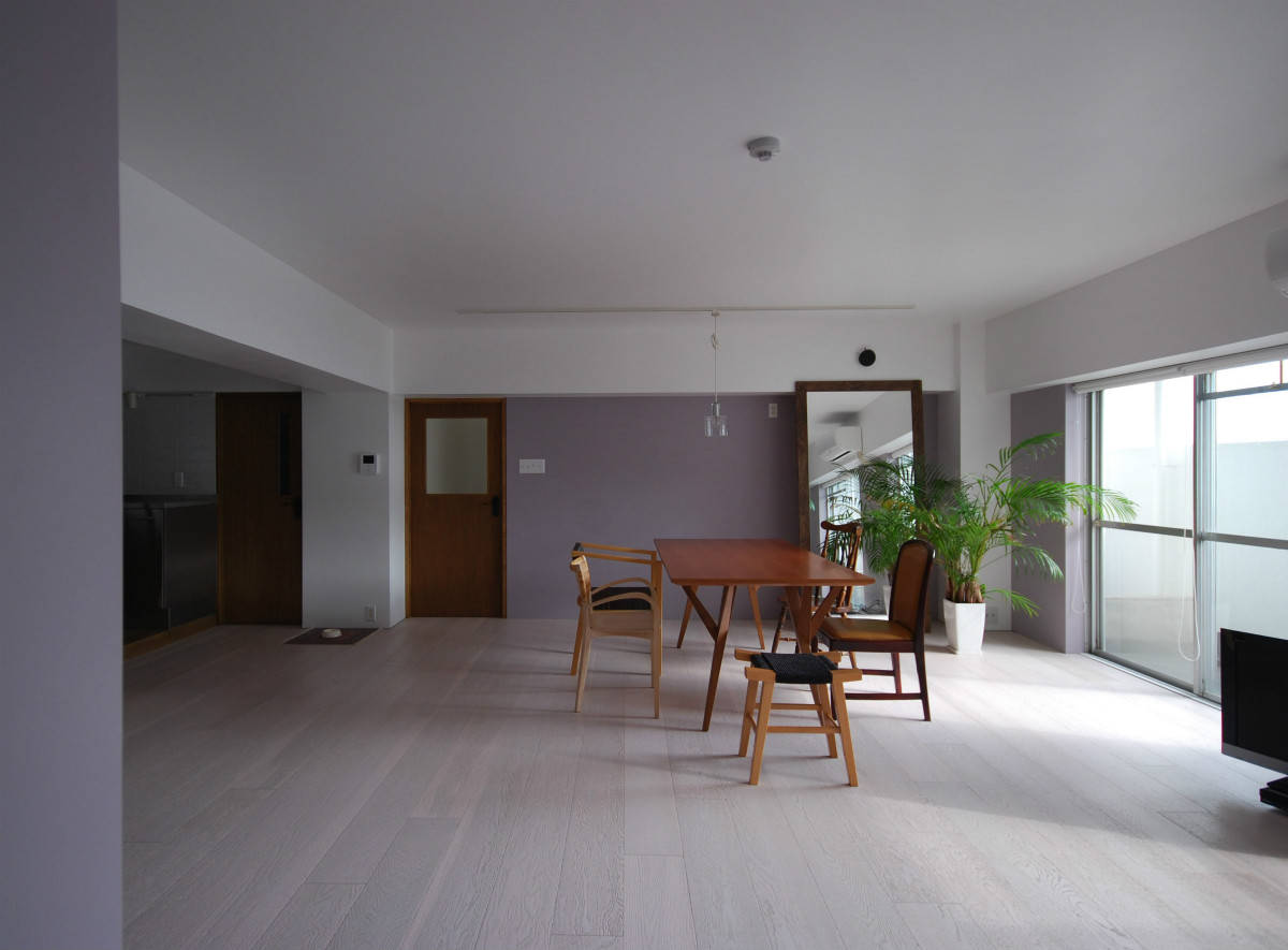 千里ニュータウンエリアに建つ、築40年の集合住宅の隣接する2室を自邸+事務所としてリノベーションしたものである。断熱を施す必要もあり、スケルトン状態から改修を行っている。広さを生かすため間仕切りは水回りを除いては玄関・LDK・寝室・事務所の4エリアのみとし、LDKおよび寝室に空間のアクセントとなる壁を配置することで倉庫およびクローゼットを確保している。また、当初の想定より面積が大きくなったため、リノベーションに掛けるコストとしては単価を抑える工夫をデザインの表現にも反映させている。モルタル金ゴテ押えの玄関土間やラワン合板を使った下足棚・食器棚・扉、LDKの壁の色などがその主なところであるが、素朴ながら単調にならないようにまとめている。