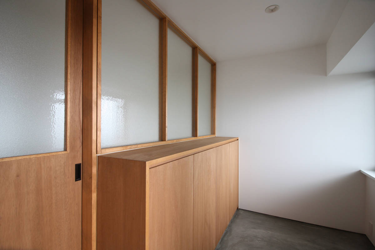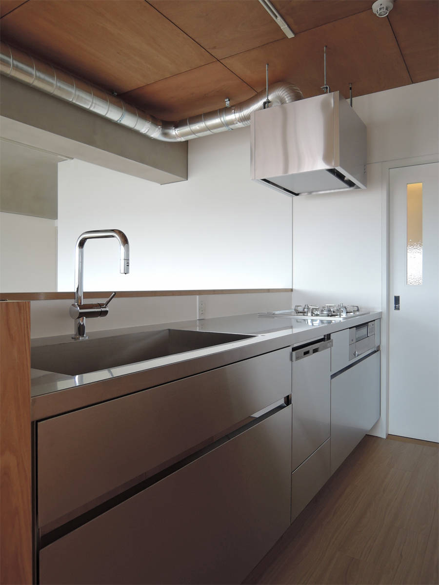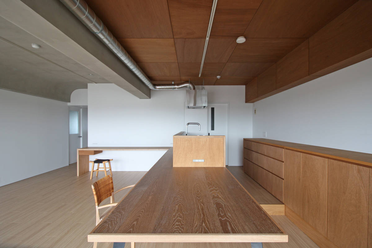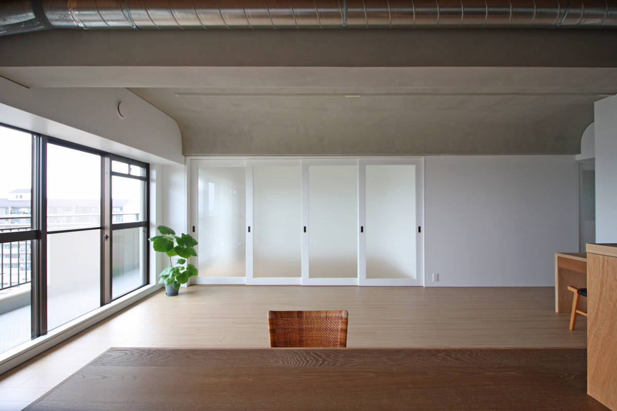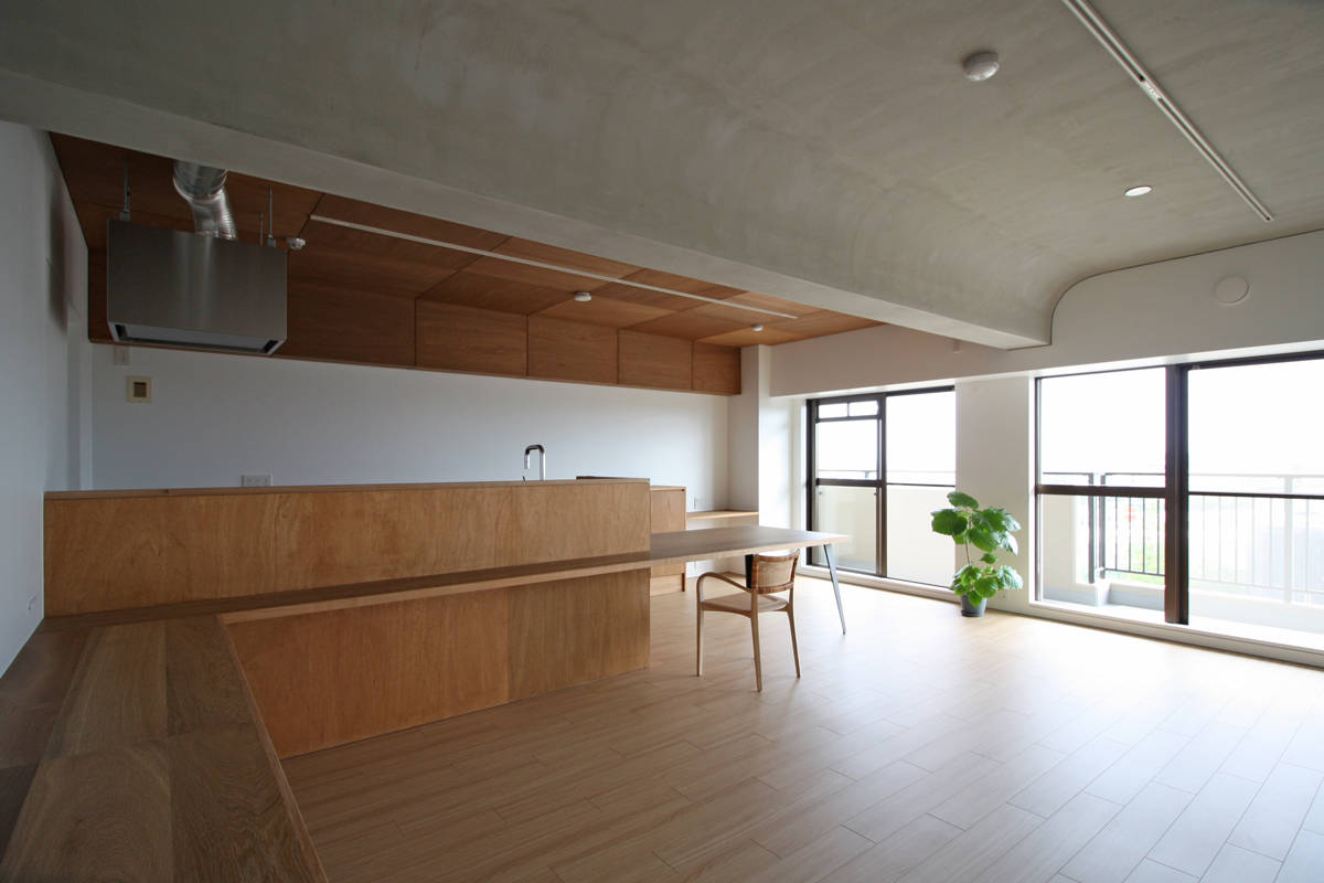 千里ニュータウンエリアに建つ、築35年の集合住宅の1室を30代の夫婦と1歳の男の子の3人家族のためにリノベーションする計画である。マンションとしては広めの90.81㎡、ワイドスパンな区画であるが、2本の梁が空間を縦断するため元は広さが感じにくい間取りとなっていた。その2本の梁をデザインの要素として積極的に使うことで、空間に変化とリズムを与え、梁で分けられるそれぞれの空間が調和することを目指した。具体的には、リビングとなる中央のスパンの梁と天井の入隅をRとして境目を無くし、モルタルで滑らかに仕上げることで両側のスパン(ダイニング/キッチン・プレイルーム)とボーダレスな印象をつくり出し、連続する空間の広がりと変化する天井仕上が調和した心地よい空間に仕上げている。一つの空間に居ながら、それぞれの場所でそれぞれの雰囲気を楽しみながら、家族がコミュニケーションをとれる場となればと考えている。