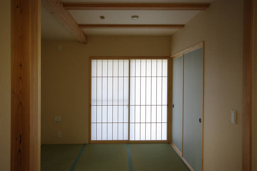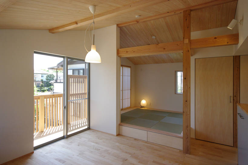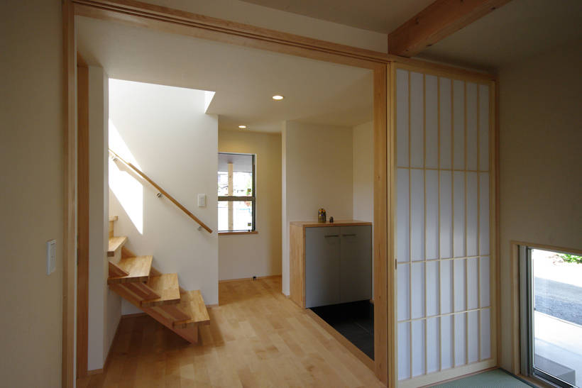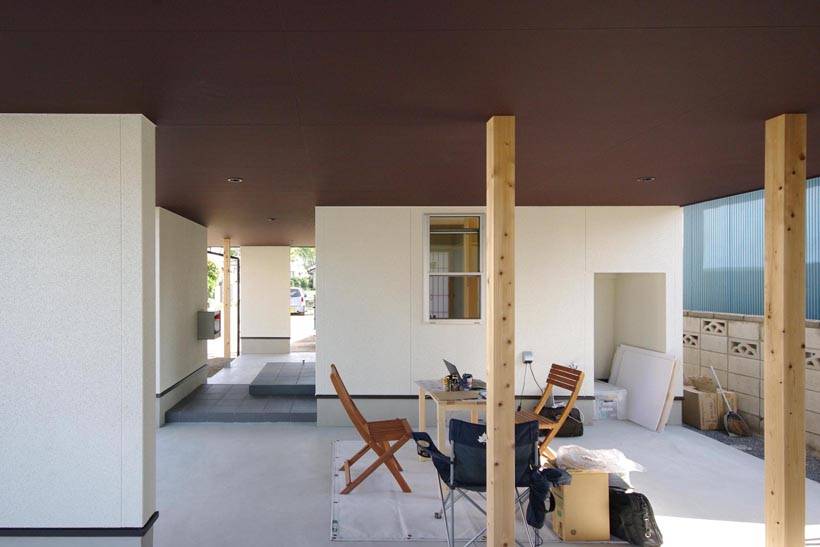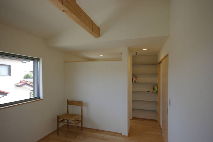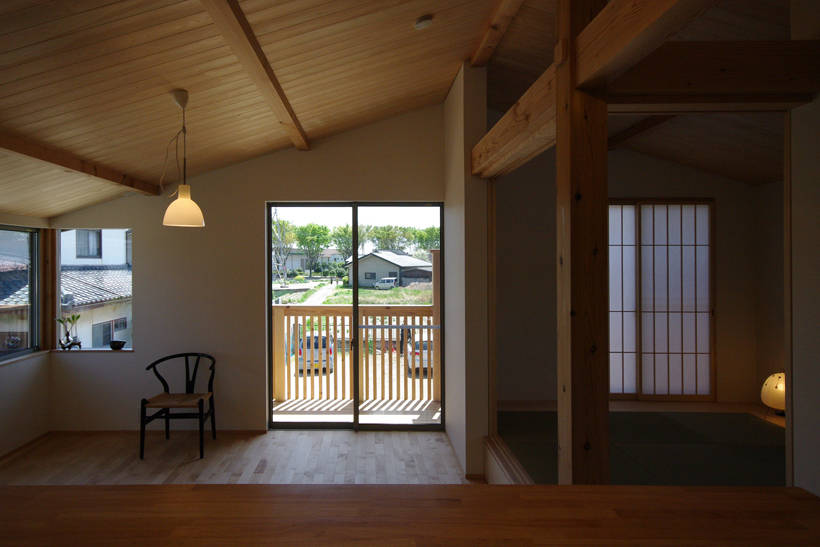 南北35m東西9mの長い敷地に建つ住宅です。二階に暮らしの全てがあることが計画の最初にあり、20坪切妻の平屋を耐震壁で丸ごと持ち上げたようなプランができました。一階は玄関と畳の客間のみ、外部は二台分の駐車スペースと軽作業もできるフリースペースとしています。雨のかからない広い外部があるというのは落ち着いて良いものです。二階はキッチンを中心に据えて南は居間と畳小上りが桧張りの勾配天井で繋がり、北への廊下を広げ天窓を設けて洗面兼室内干しスペースとし、そこからトイレ・浴室・寝室へ出入りする動線としています。お施主様に合わせた暮らしやすい住まいになるよう気を付けてまとめました。(長期優良住宅)