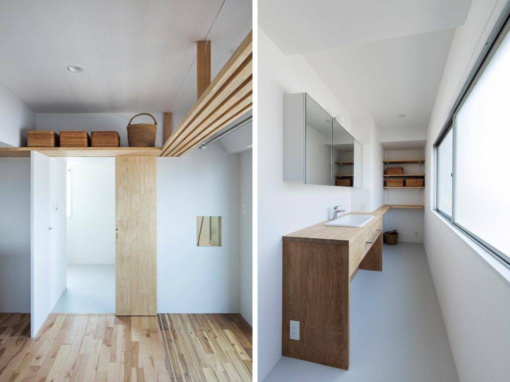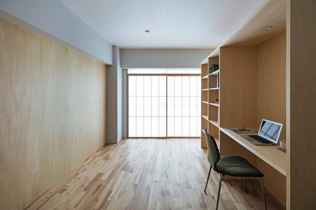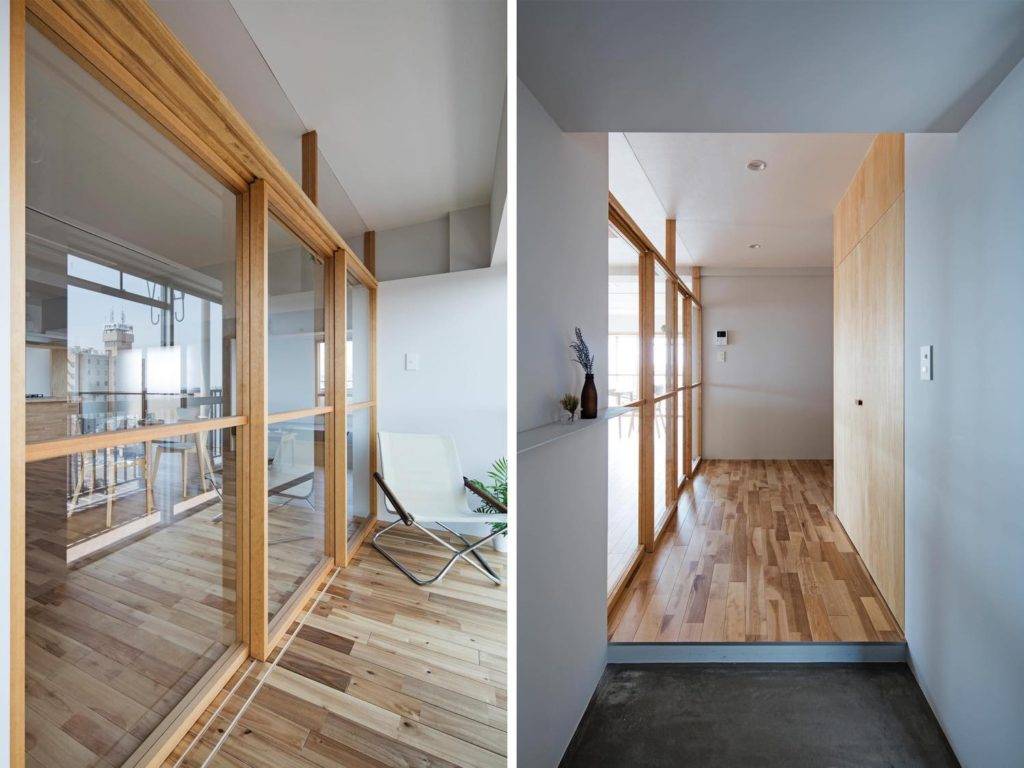 繋げられていた2戸のうち、角部屋の方の主室と水回りなど、もう一方を寝室と納戸などにあてた。主室は、半屋外的なルームテラス・ランドリーテラスやソファースペースなど、タイプの違う場を外壁沿いに配置し、入れ子状の構成をとっている。これらの間には、透明ガラス・フロストガラス・シナ合板を鏡板にした木製框戸を入れ、各々の場との距離や視線などの調整を行っている。框は見付け30㎜で、木製建具としては非常に細いつくりになっている。これは中間層を設けたことによる、主室と外部の距離感を減じるためである。またこの框は、鴨居や欄間の枠とも同じ見付けであり、枠と框が一体的な透明性の高い境界面となる。寝室側は、シナ材によるフラッシュ戸と壁で統一している。主室側とは対照的に不透明な境界だが、開くたびに空間が展開していく奥性をつくりだしてる。