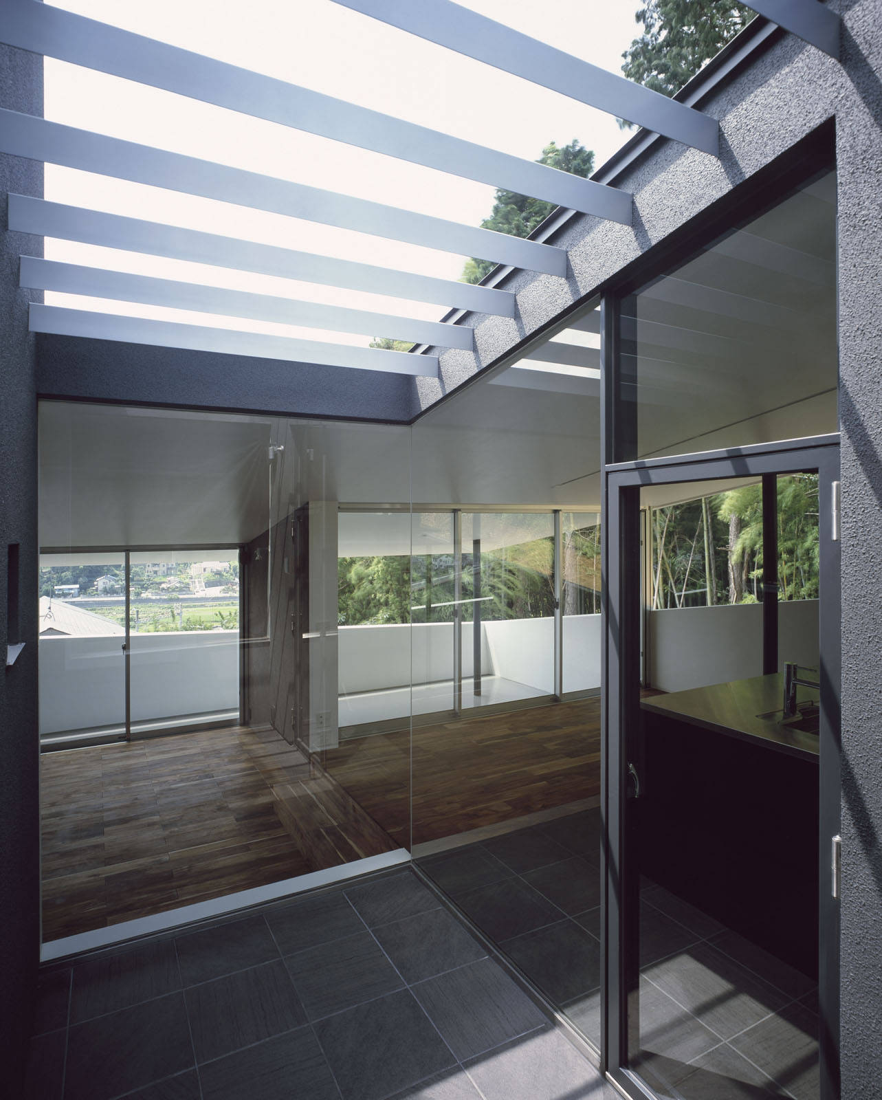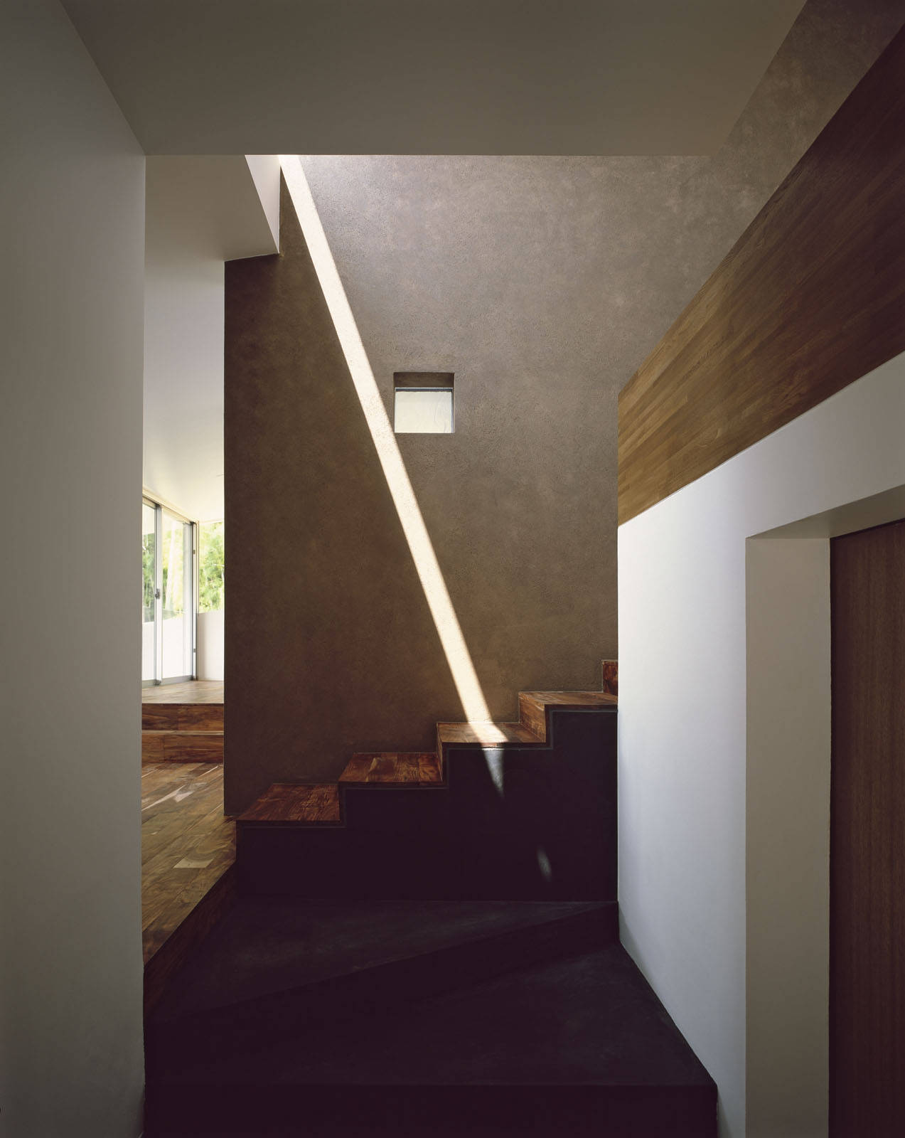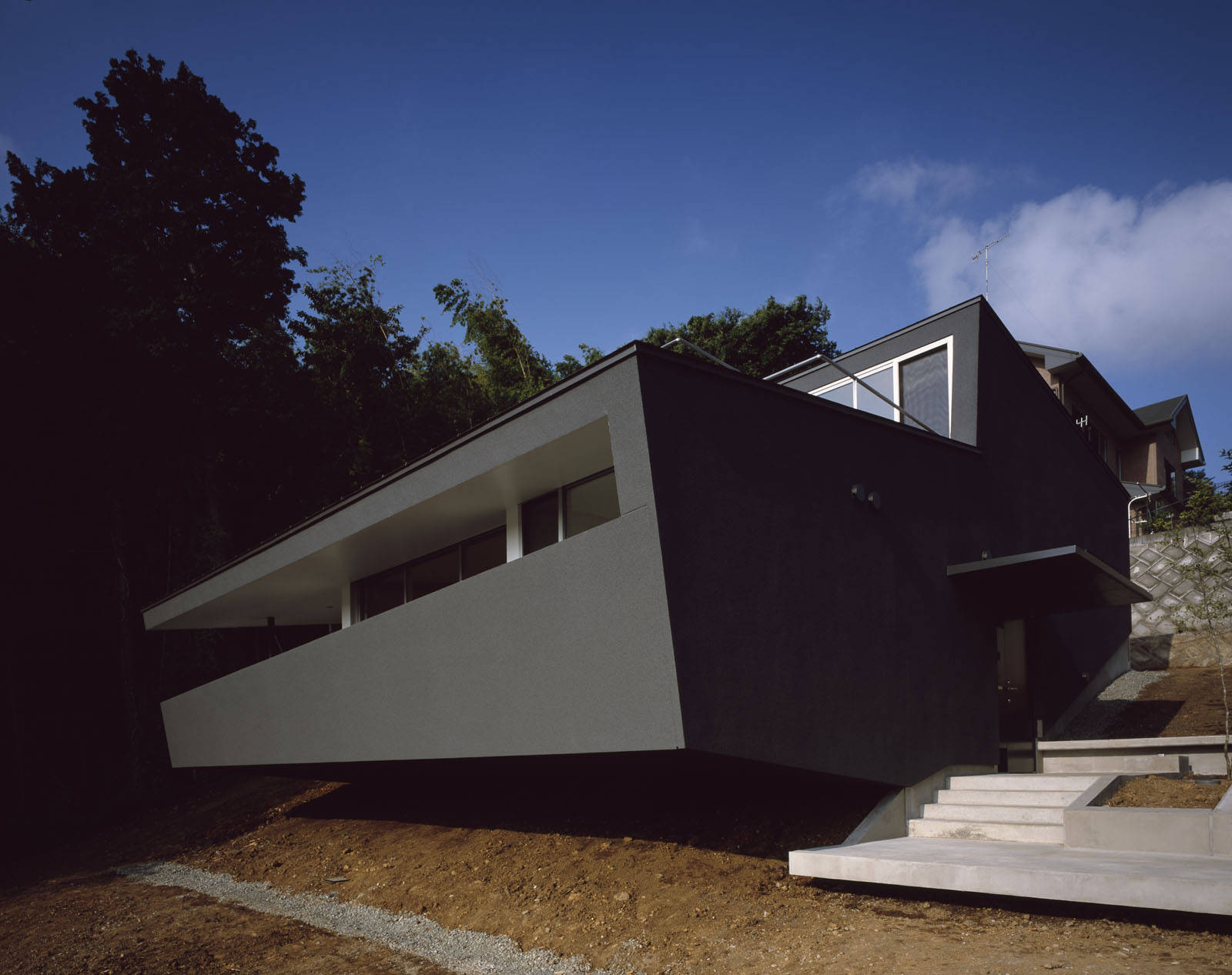 丹沢山系を望む傾斜地に建つ住宅。斜面に逆らわない勾配屋根とし、内部空間は床のレベル差によりゆるやかに分節しつつ、各領域の開放性を調節した。山並みに向かう眺望だけを手がかりとせず、移動によるシーンの展開を大切にした計画となった。