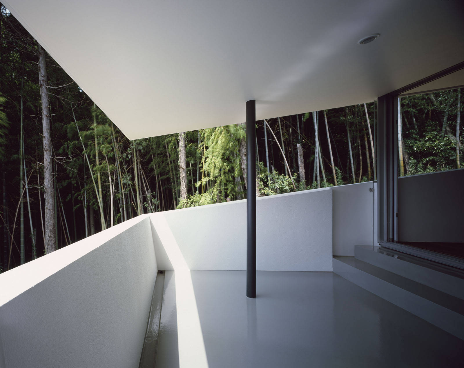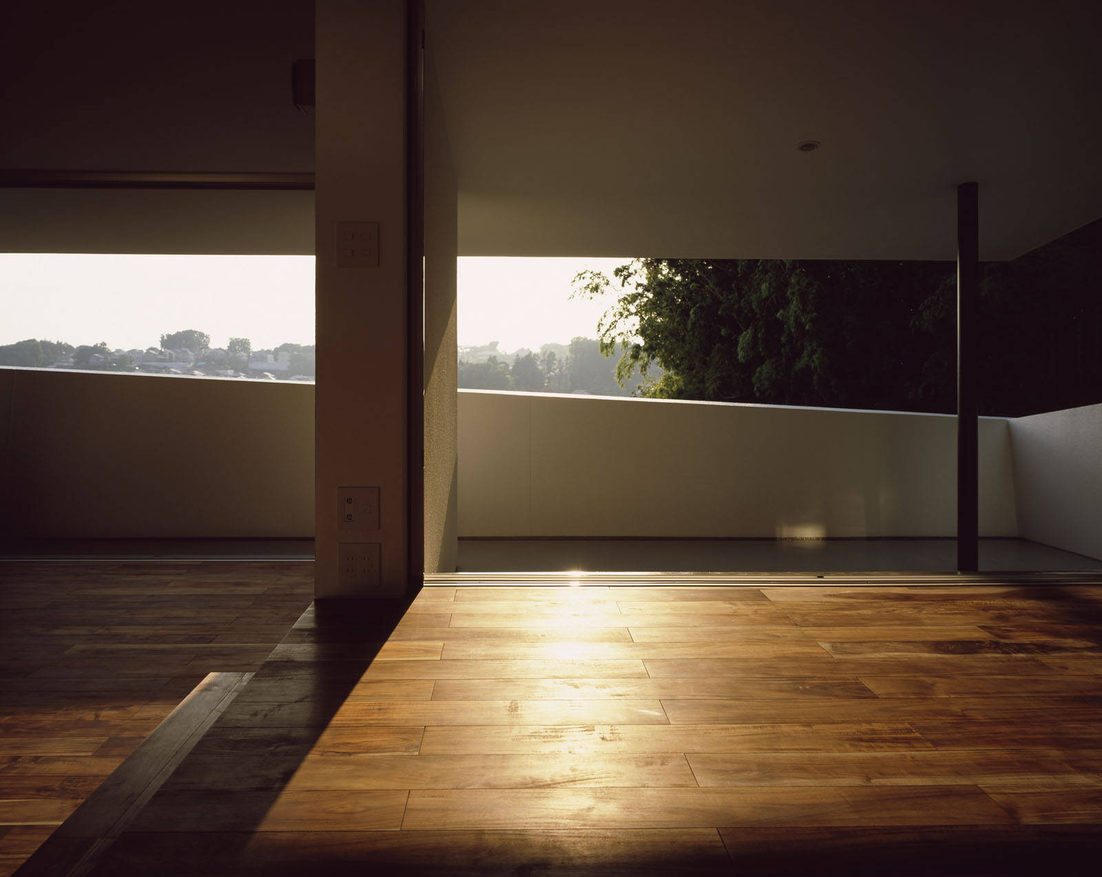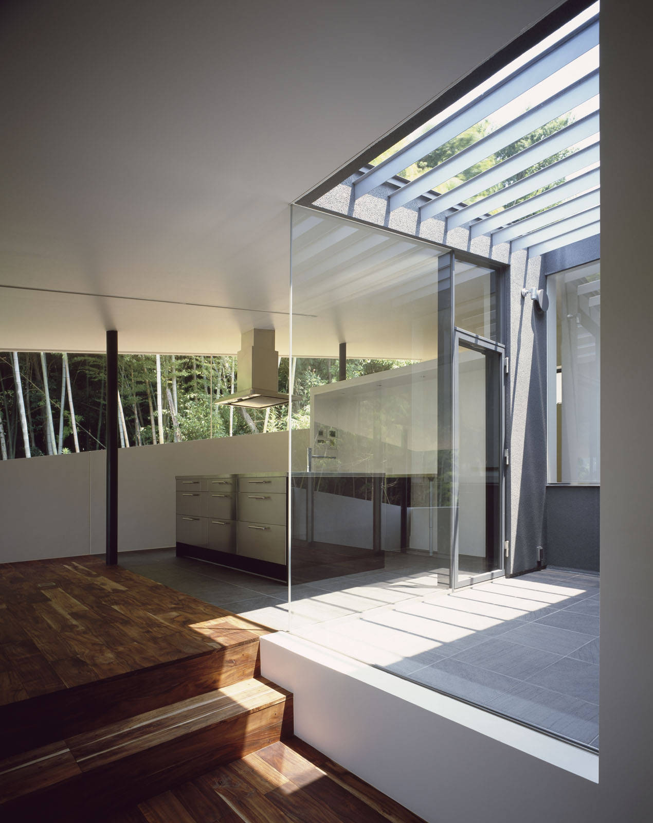 丹沢山系を望む傾斜地に建つ住宅。斜面に逆らわない勾配屋根とし、内部空間は床のレベル差によりゆるやかに分節しつつ、各領域の開放性を調節した。山並みに向かう眺望だけを手がかりとせず、移動によるシーンの展開を大切にした計画となった。