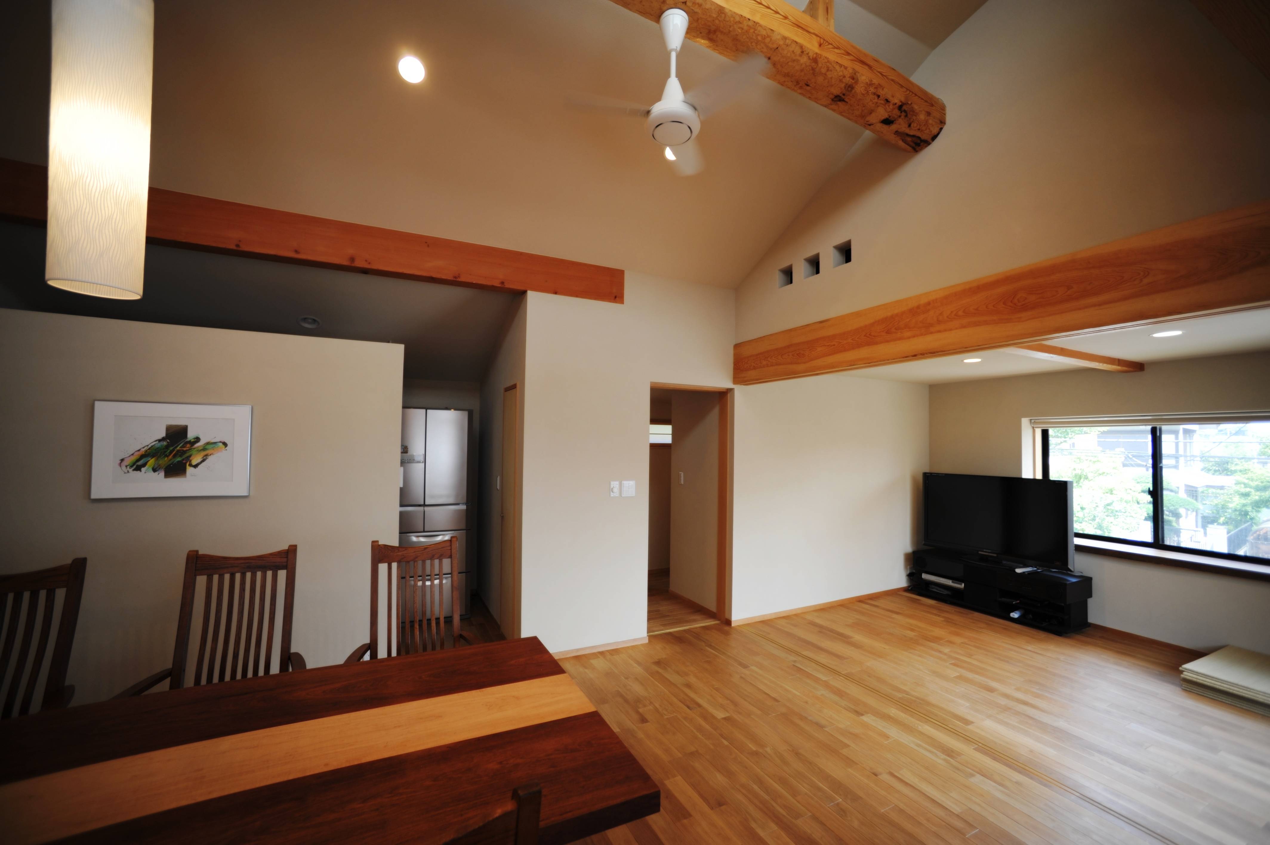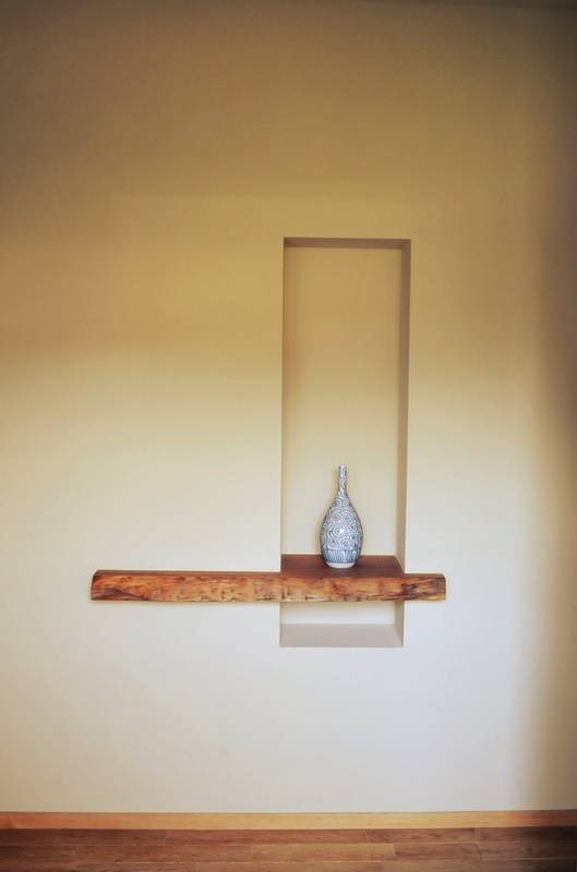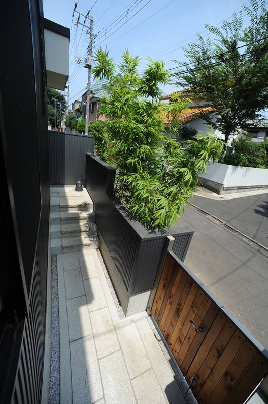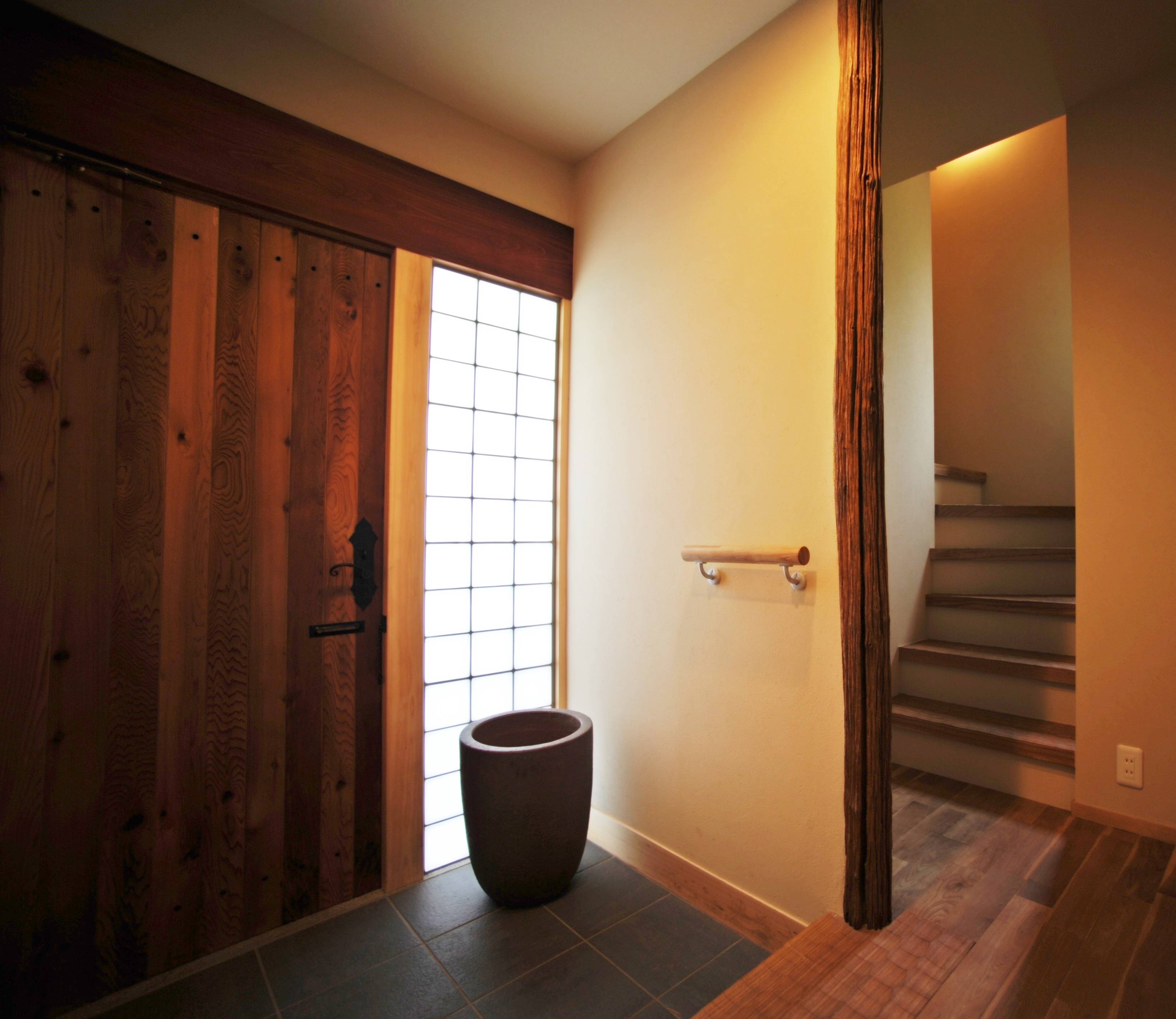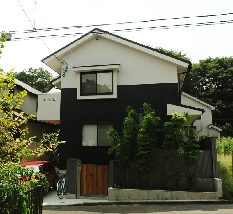 風致地区にあるこの建物は、外壁を敷地境界から1m以上離さねばならず、このスペースを利用して玄関アプローチとした。敷石には、ホームセンター購入した御影石を使用する。無機質な外装材で包まれた家の内部には、銘木屋で見つけた個性のある木材をふんだんに使い、障子や小さな床の間をしつらえ、和風建築の名残を残した。