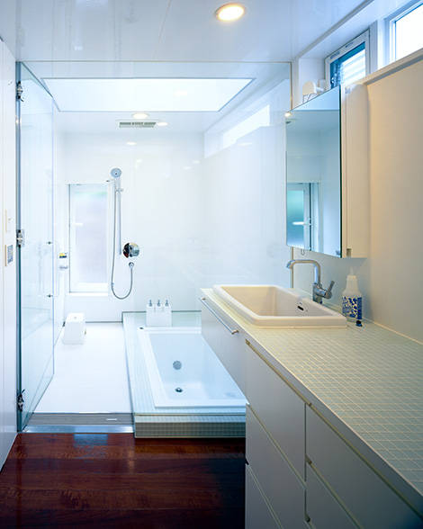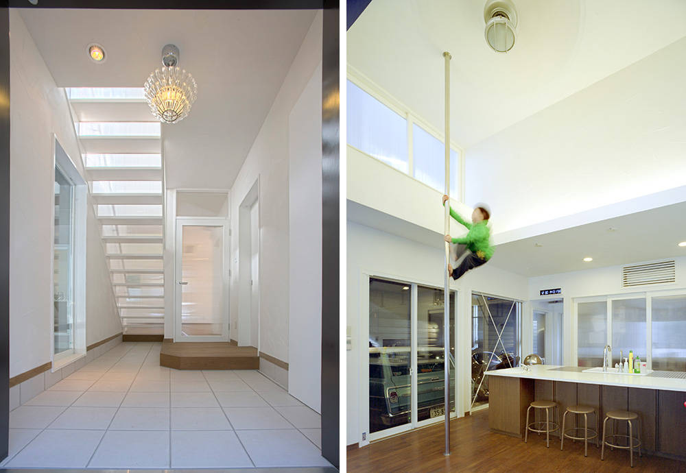 その他、玄関から直接お風呂へ行ける動線があったり、2階から1階へ消防隊のように下りられるパイプがあったり、子供部屋の壁が黒板だったり、2階廊下の床がガラスになっていてガレージがのぞけたり、オーダーメイドのキッチンがあったりといろいろ楽しい仕掛けがいっぱいの住宅です。