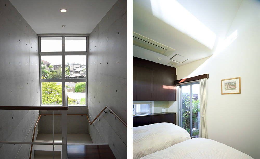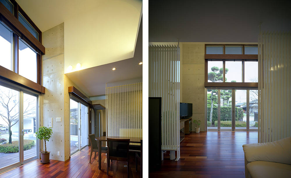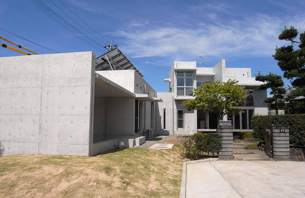 内部空間は、朝日や南西からの海風の取り込みを意識しながら必要最低限の部屋を作り、統一感のあるシンプルでプレーンな仕上げとし、室内でもコンクリート造独特のシンプルモダンを感じられるようにいています。特に一日の大半を過ごすリビング・ダイニングは、吹抜けや大きな開口部を造り、開放感のある気持ちのいい空間となっています。またこの空間は音楽を聞く事が趣味の建て主にとってリスニングルームでもある為、吸音の為の有孔建具や除湿型放射冷暖房(HR-C)も採用しています。HR-Cは、除湿を行なうだけでなく音が一切しないシステムなので快適に音楽を聞く事が出来ます。その他、太陽光発電パネルやIHヒーター、エコキュートなどを採用したオール電化住宅でもあります。